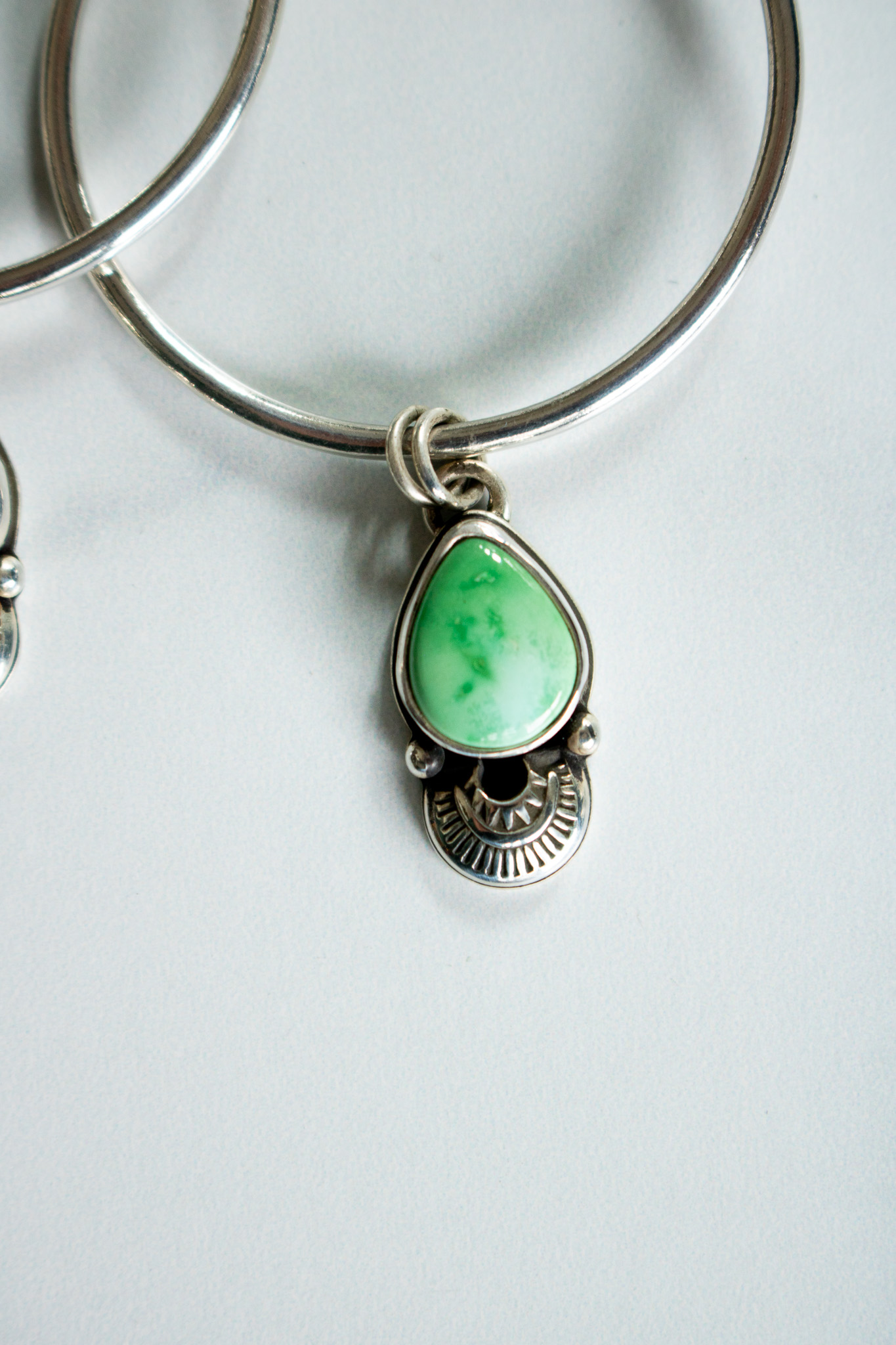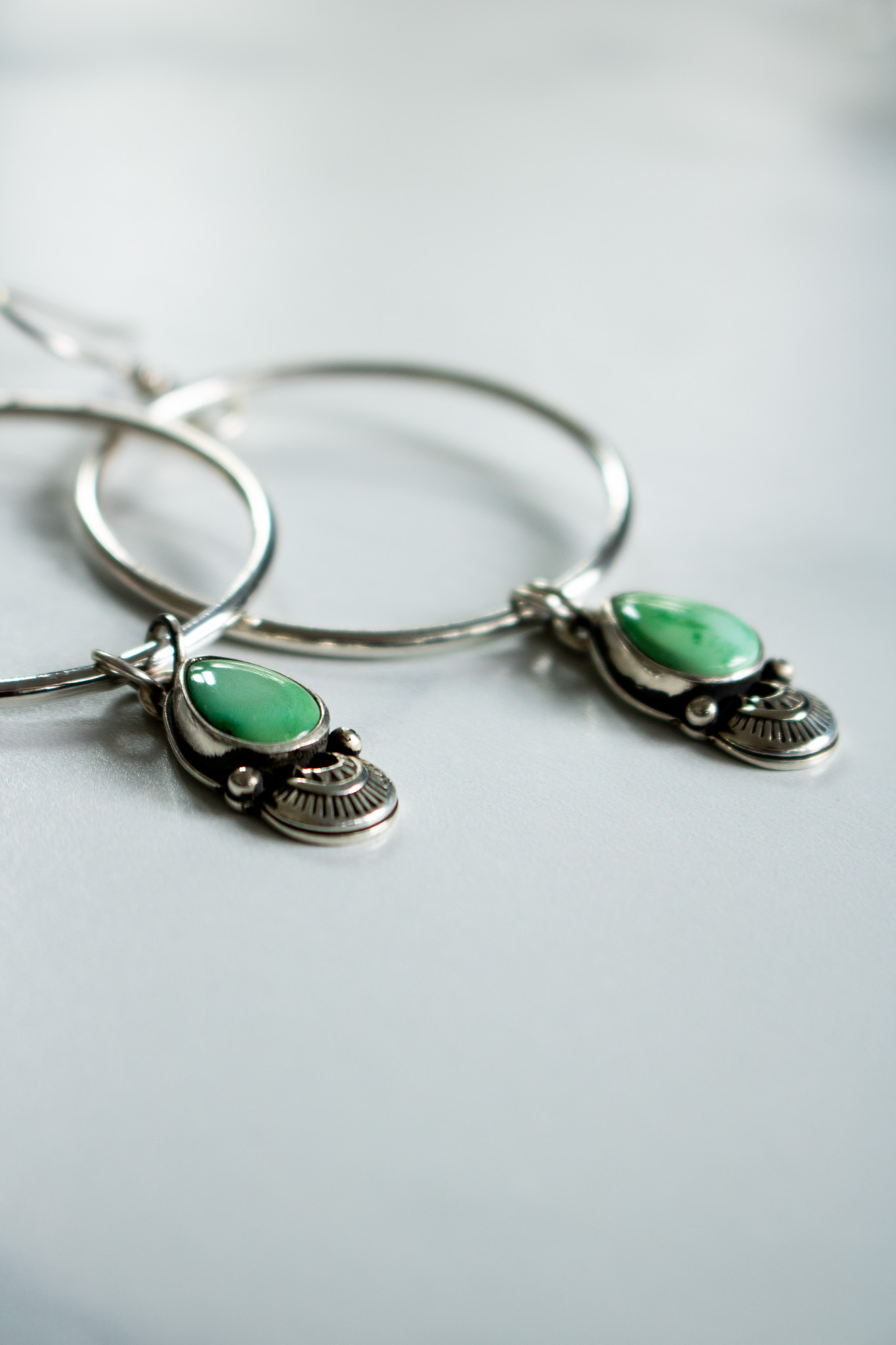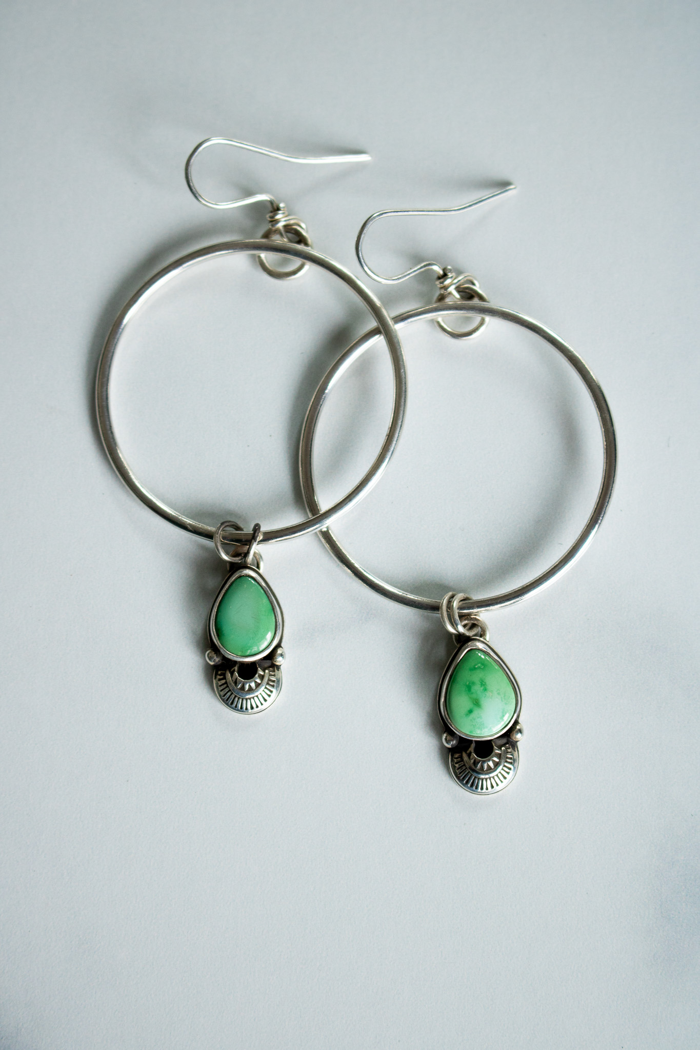 The central hoops measure just over 1.5” across and from them hang vibrant Emerald Valley turquoise pendants with hand stamped embellishments. The pendant is marked with a marker’s mark and both pendant and hoop is given a high shine finish.