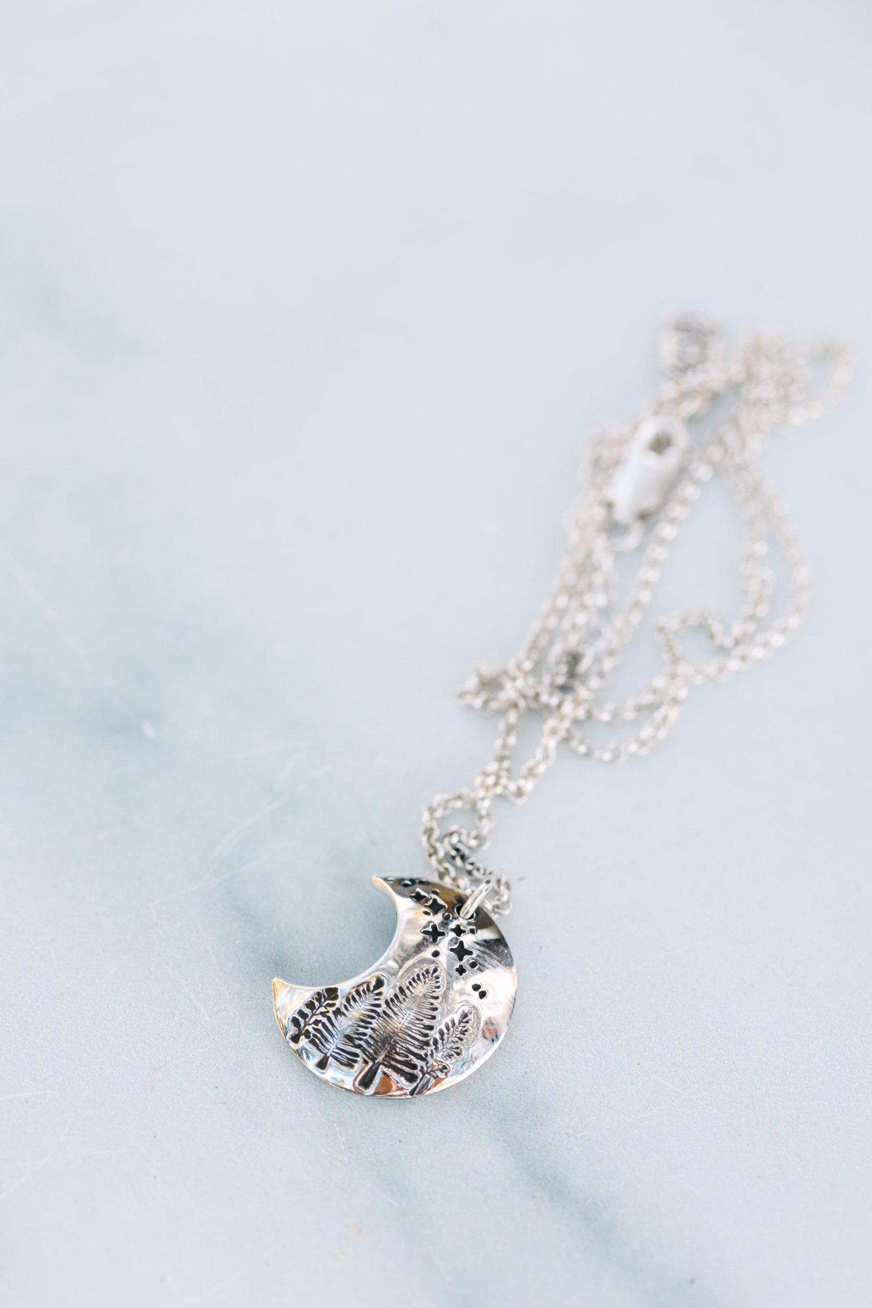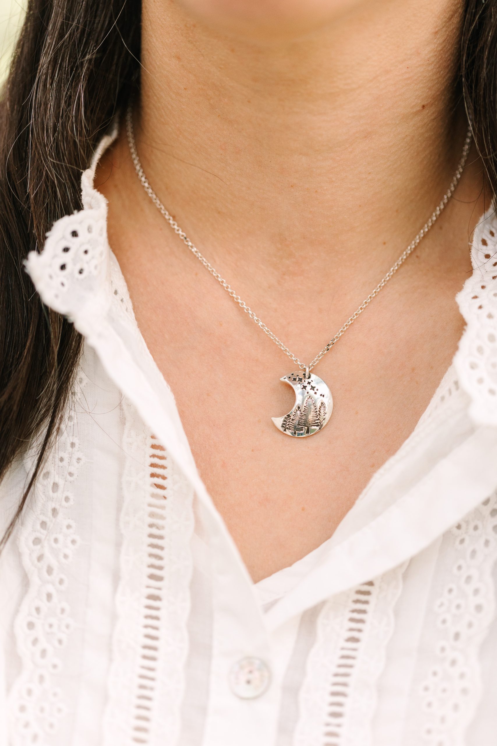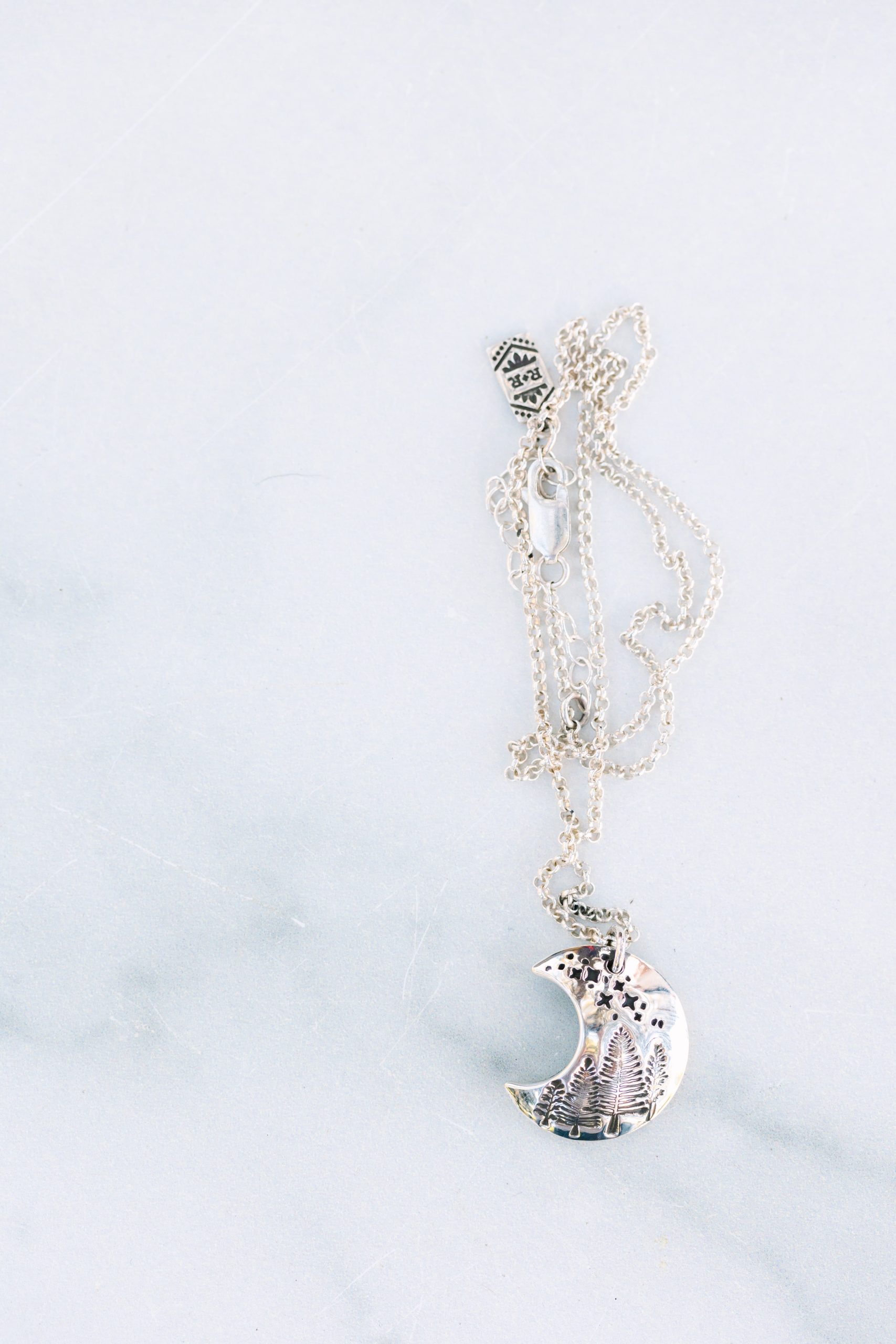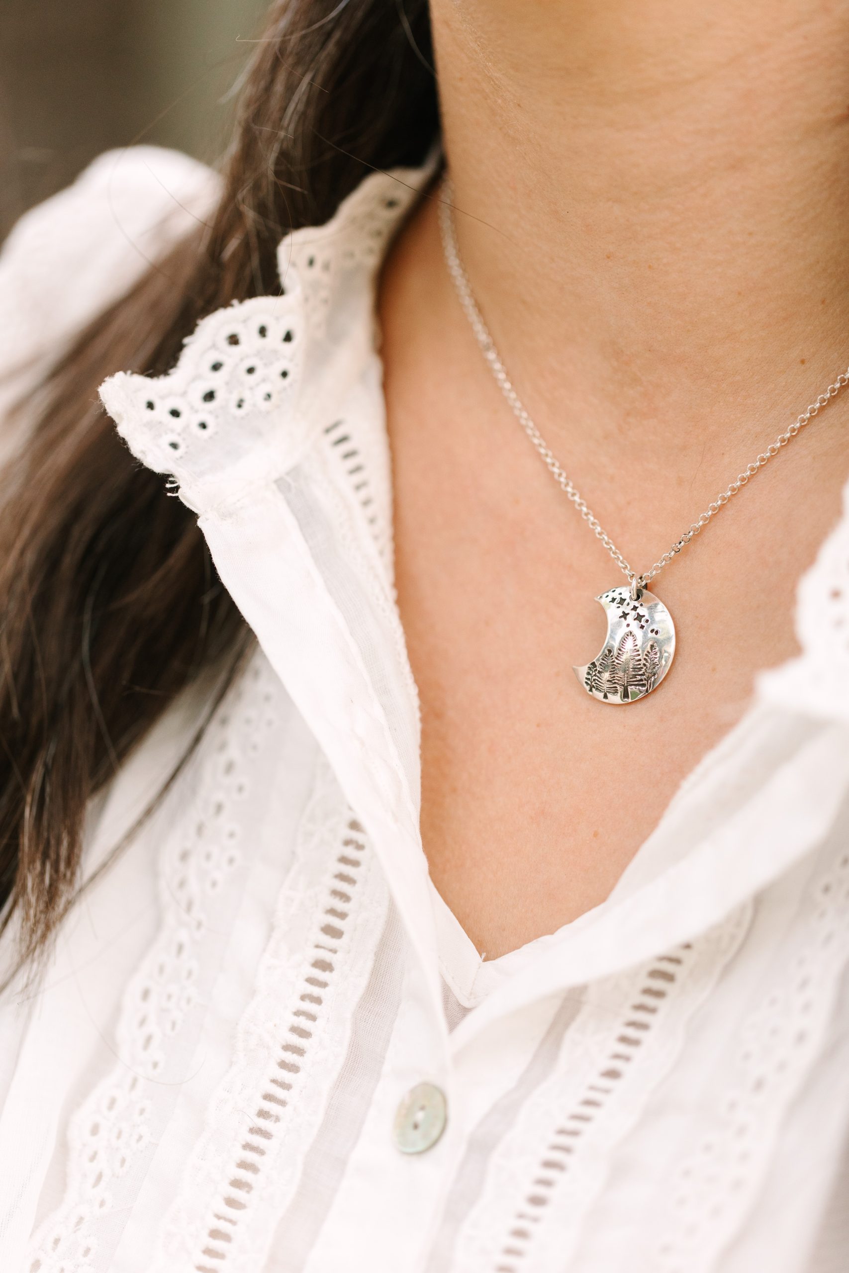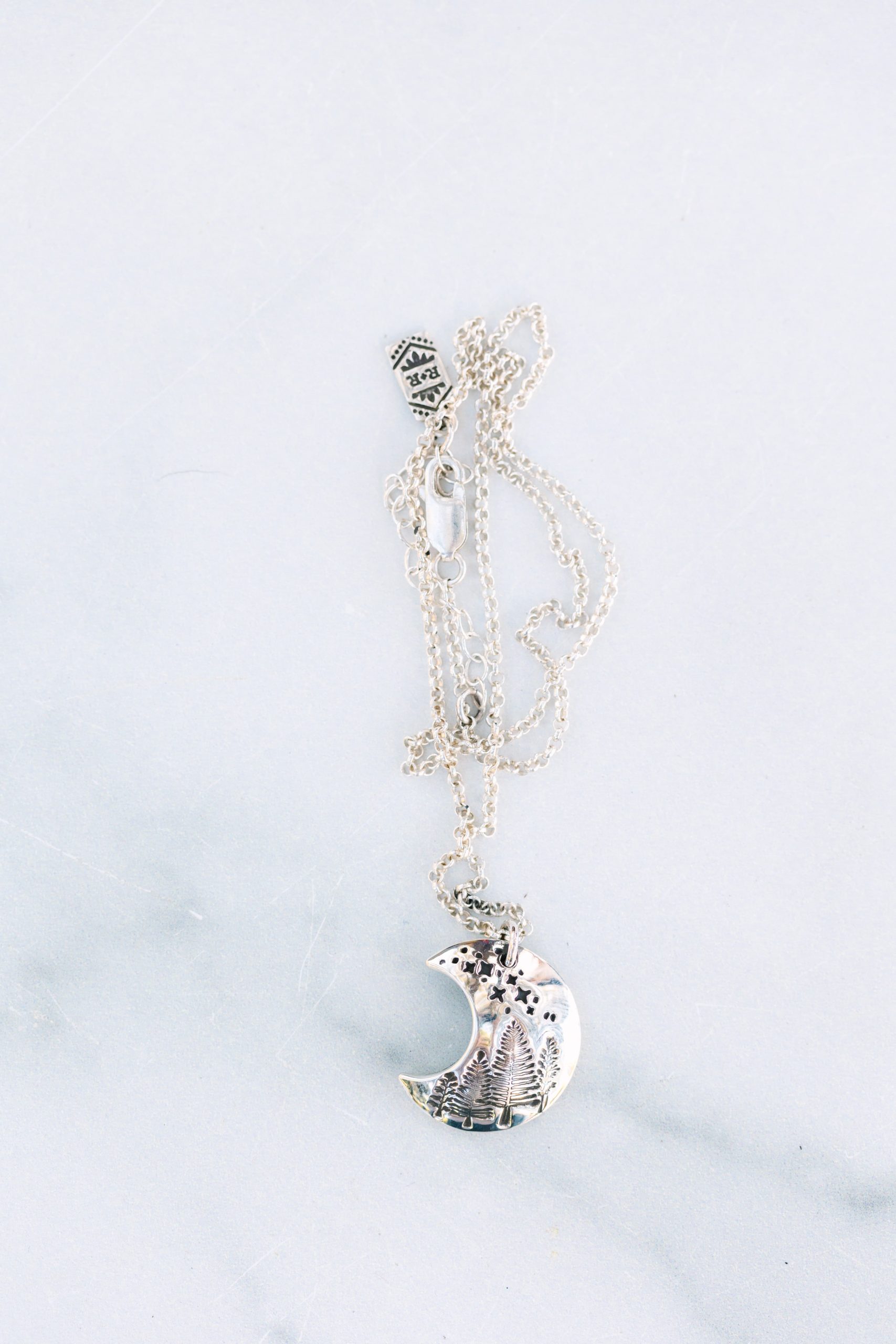 Flagstaff was the first international dark skies city and we just love our night sky. To pay homage to that, this pendant features a mix of hand stamped pine and aspen trees under a star strewn sky. With its adjustable length, its perfect for layering or on its own.