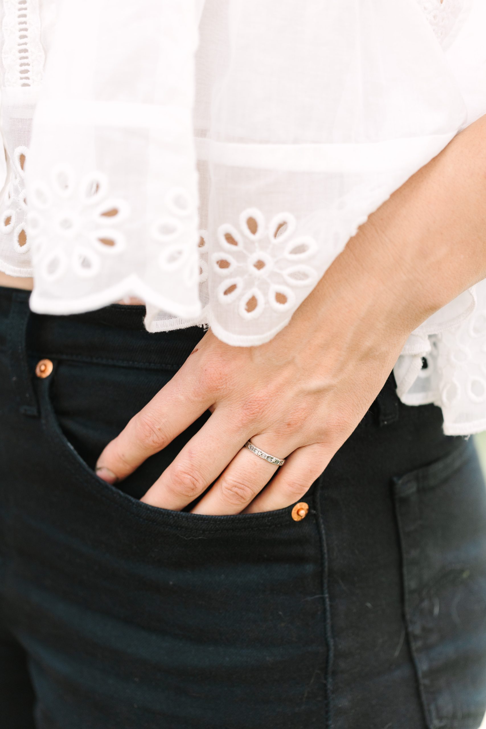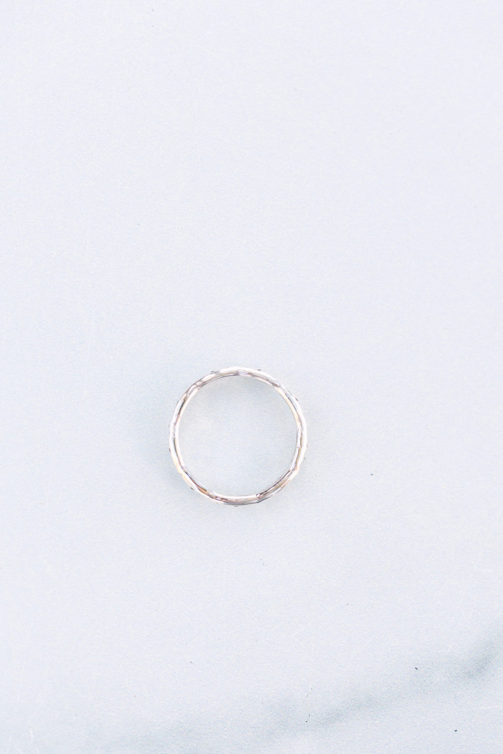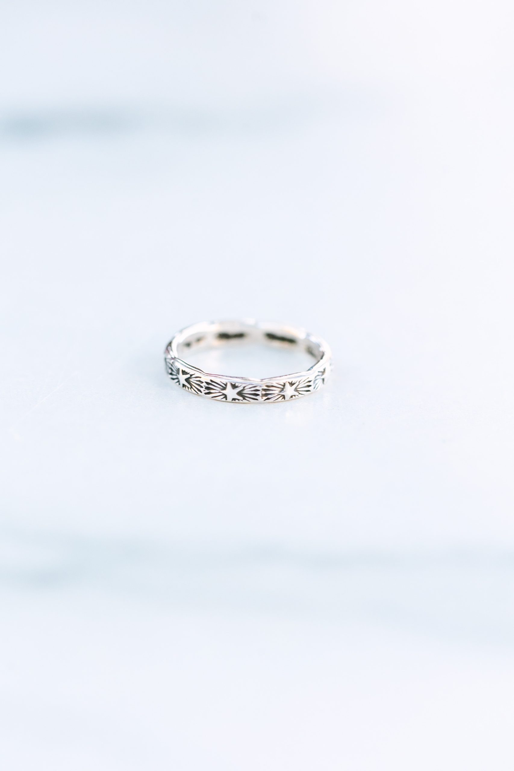 This ring starts as a solid 10g full-round sterling silver wire. I hammer it flat to create a subtle, organic texture. The hand-stamped star pattern adds celestial charm, while the oxidized finish enhances depth and character. A high-shine polish brings out the silver’s natural brilliance.