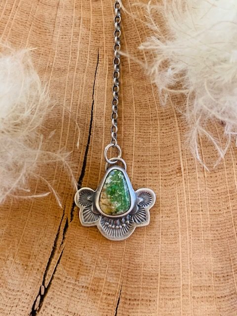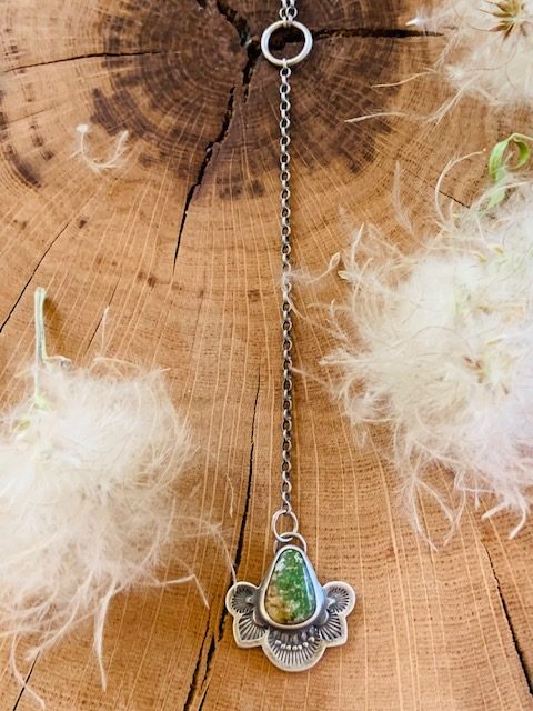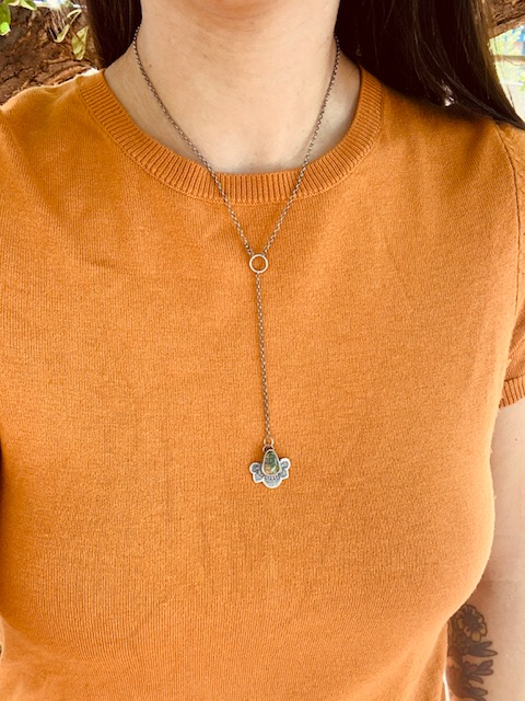Handstamped sterling and Sonoran Gold lariat. It measures 18″ to the ring with another 3.5″ drop to the pendant. Pendant is 1″ long. Chain and pendant are oxidized and given with a soft satin finish.