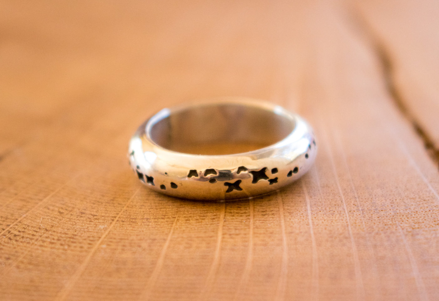 Sterling silver stacking ring with hand stamped galaxy detail. Oxidized and polished to a high shine. Great as a stand alone ring or stacked with other rings. Band is 3/16” wide and a size 5.5