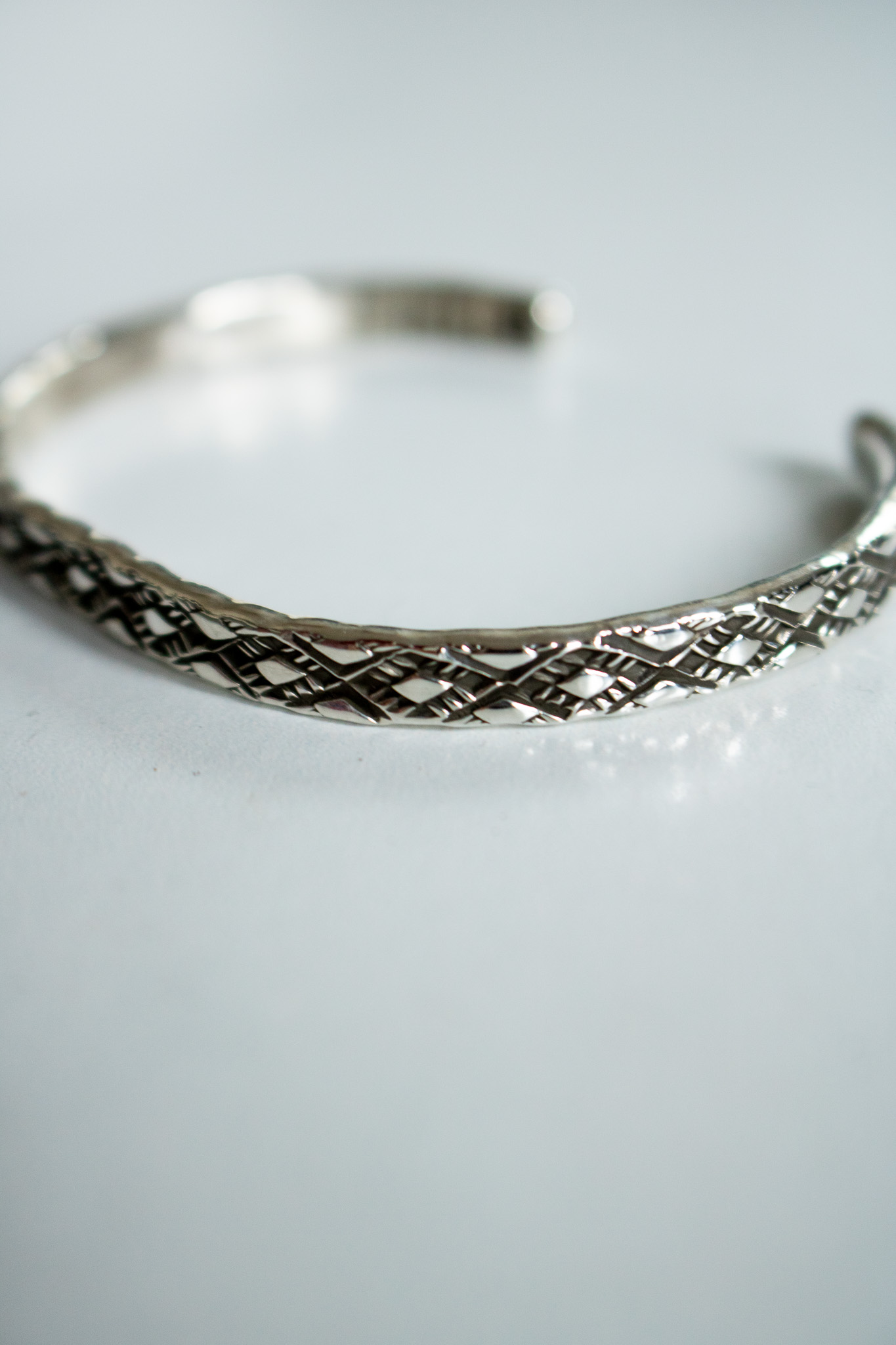 The cuff starts out as full round sterling wire that I hammer flat and then hand stamped. After its been shaped into a cuff, its oxidized to highlight the detail and then polished to a high shine and given an R&R mark inside in the band. Band is 3/16” wide and is in 5.75” length (medium size) but can be sized down upon request.