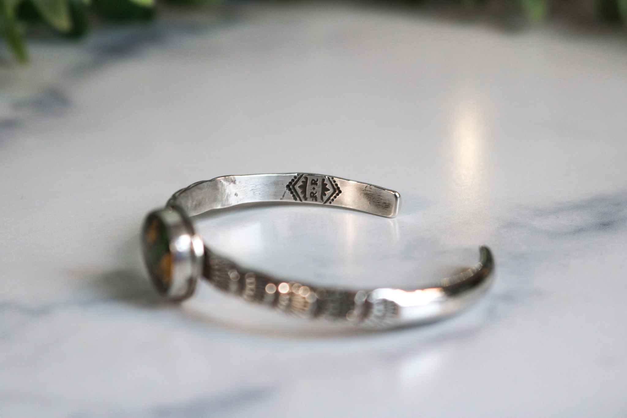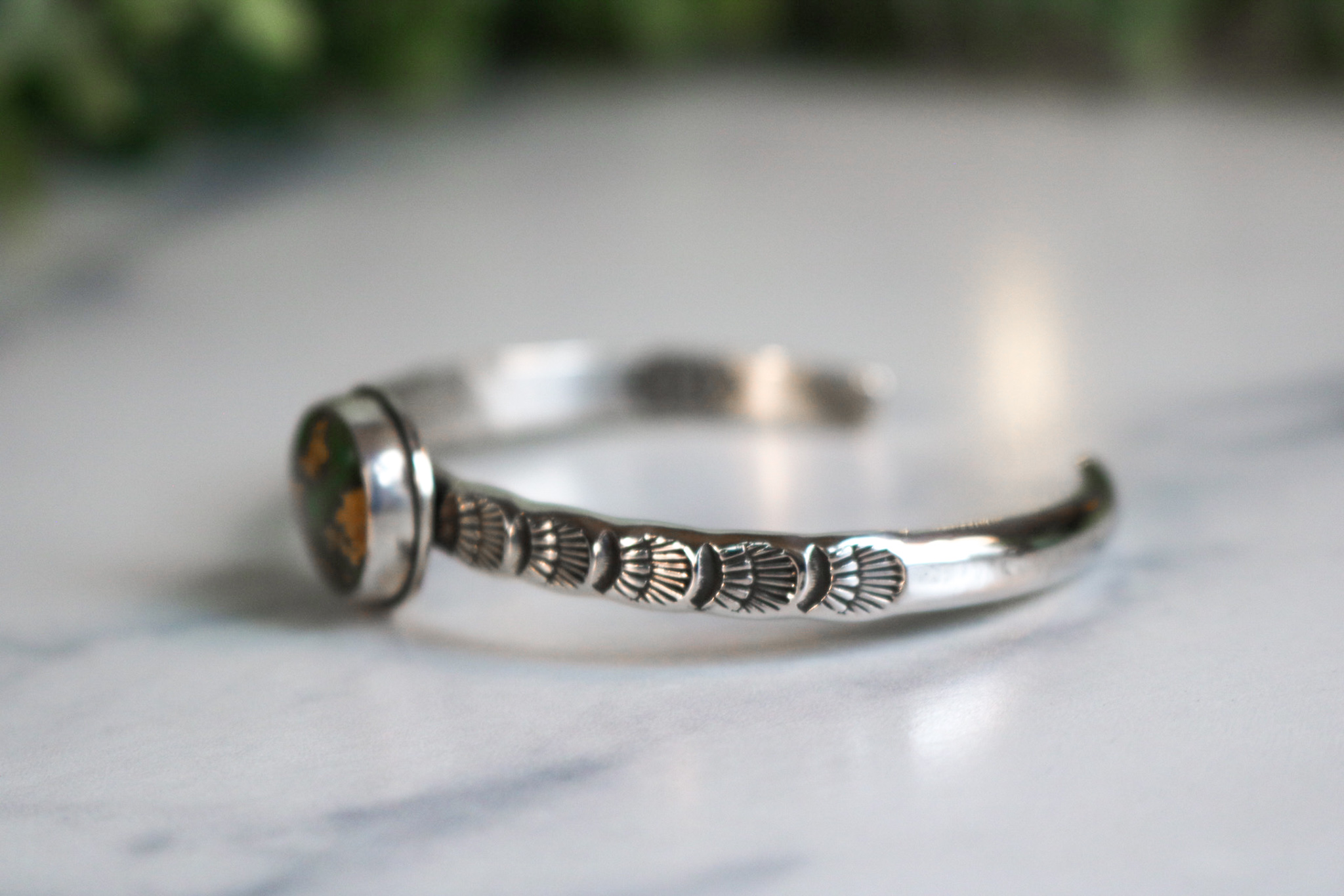 Sterling silver stacking cuff with hand stamped detail and gorgeous Emerald Mountain turquoise. Oxidized and polished to a high shine and finished with an R+R makers mark inside in the band. The stone measure’s 1/2″ tall and just under 3/4″ wide Band is 3/16” wide and is 5.75” in length (medium size) but can be sized down upon request.