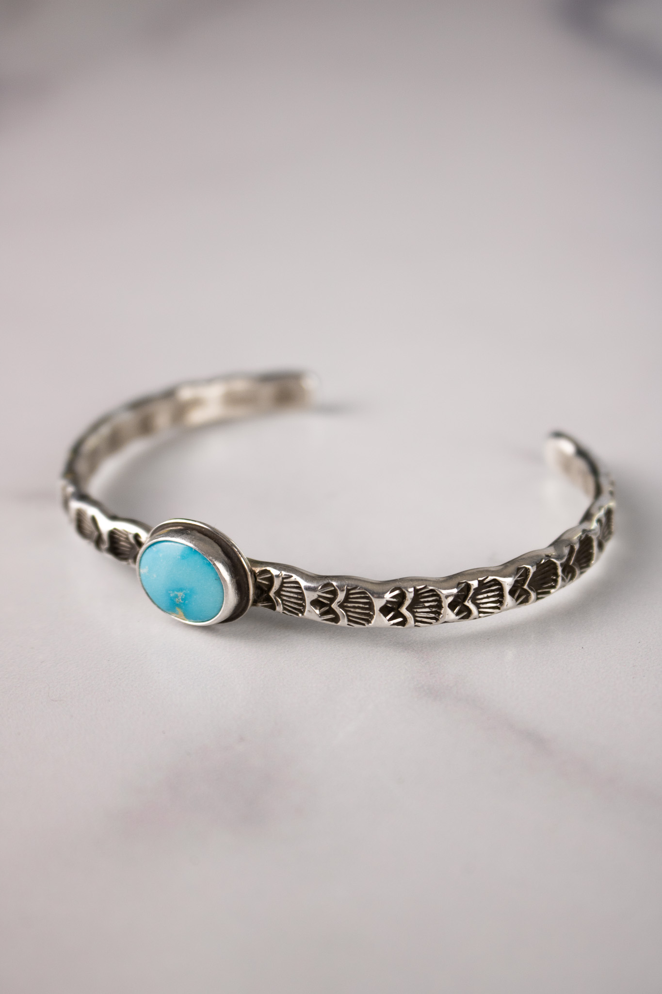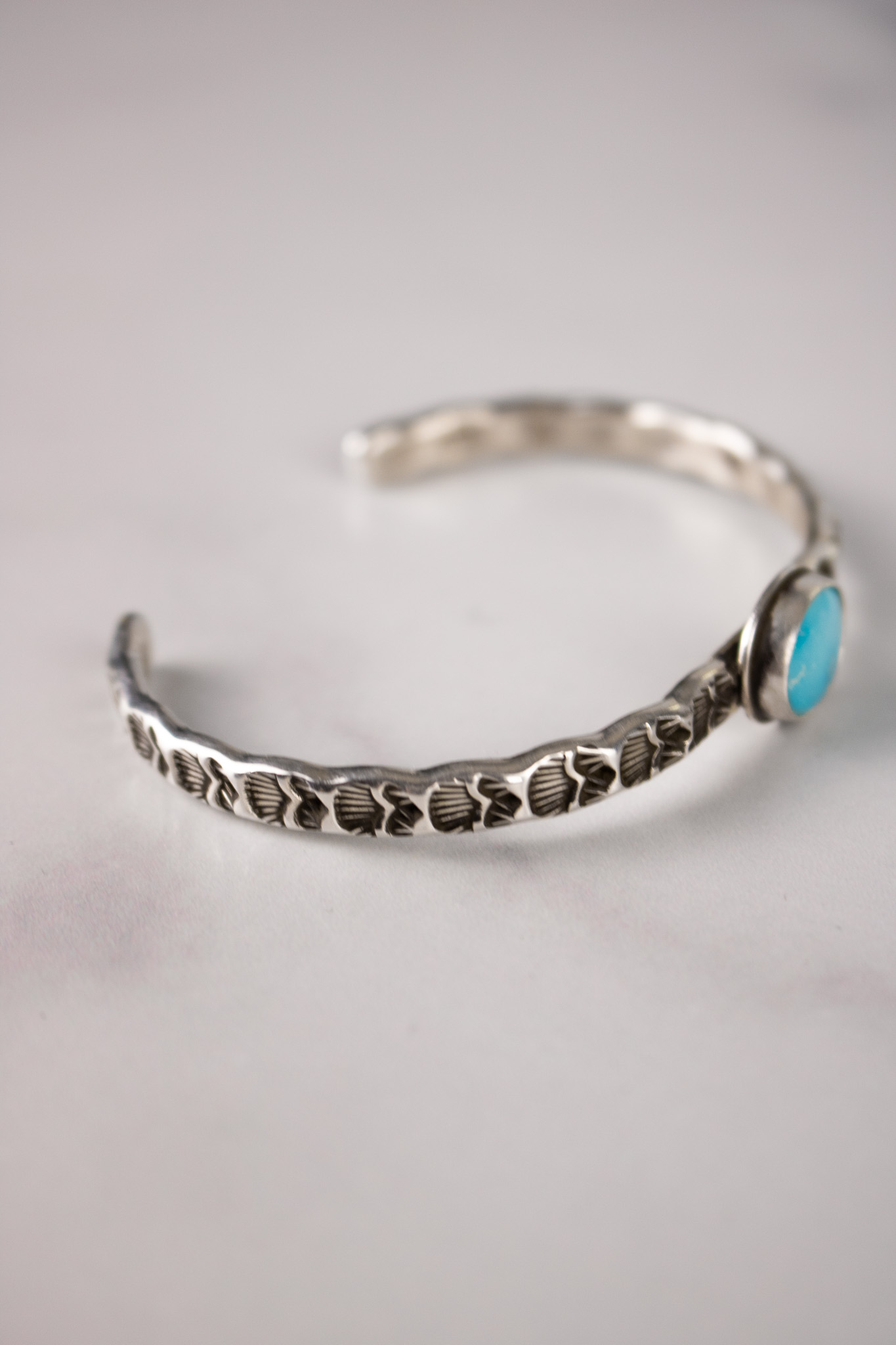 Sterling silver stacking cuff with hand stamped detail and blue ridge turquoise at its center. Oxidized and polished to a high shine and finished with an R&R mark inside in the band. Band is 3/16″ wide and measures 5.5” in length (medium size) but can be sized down upon request.