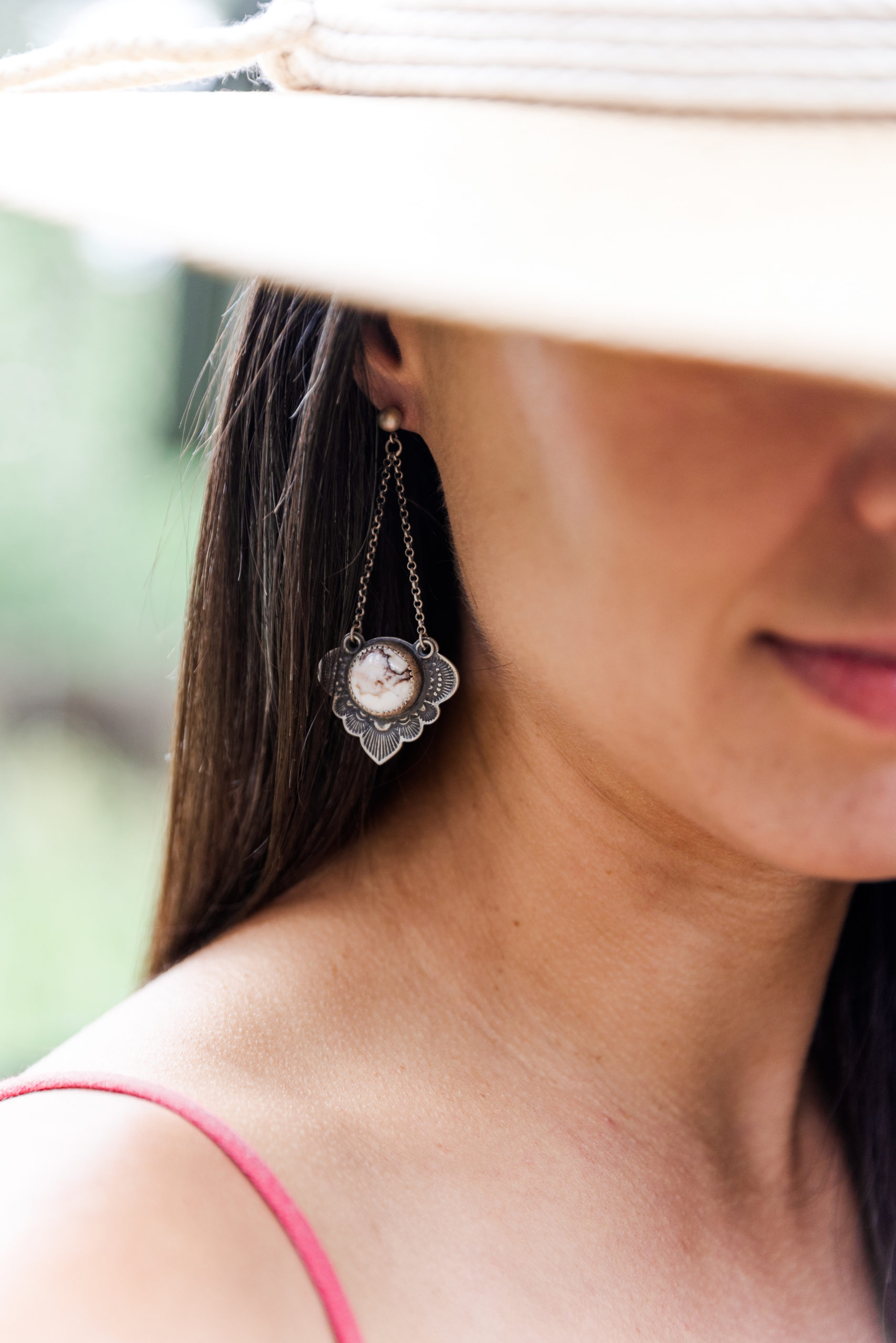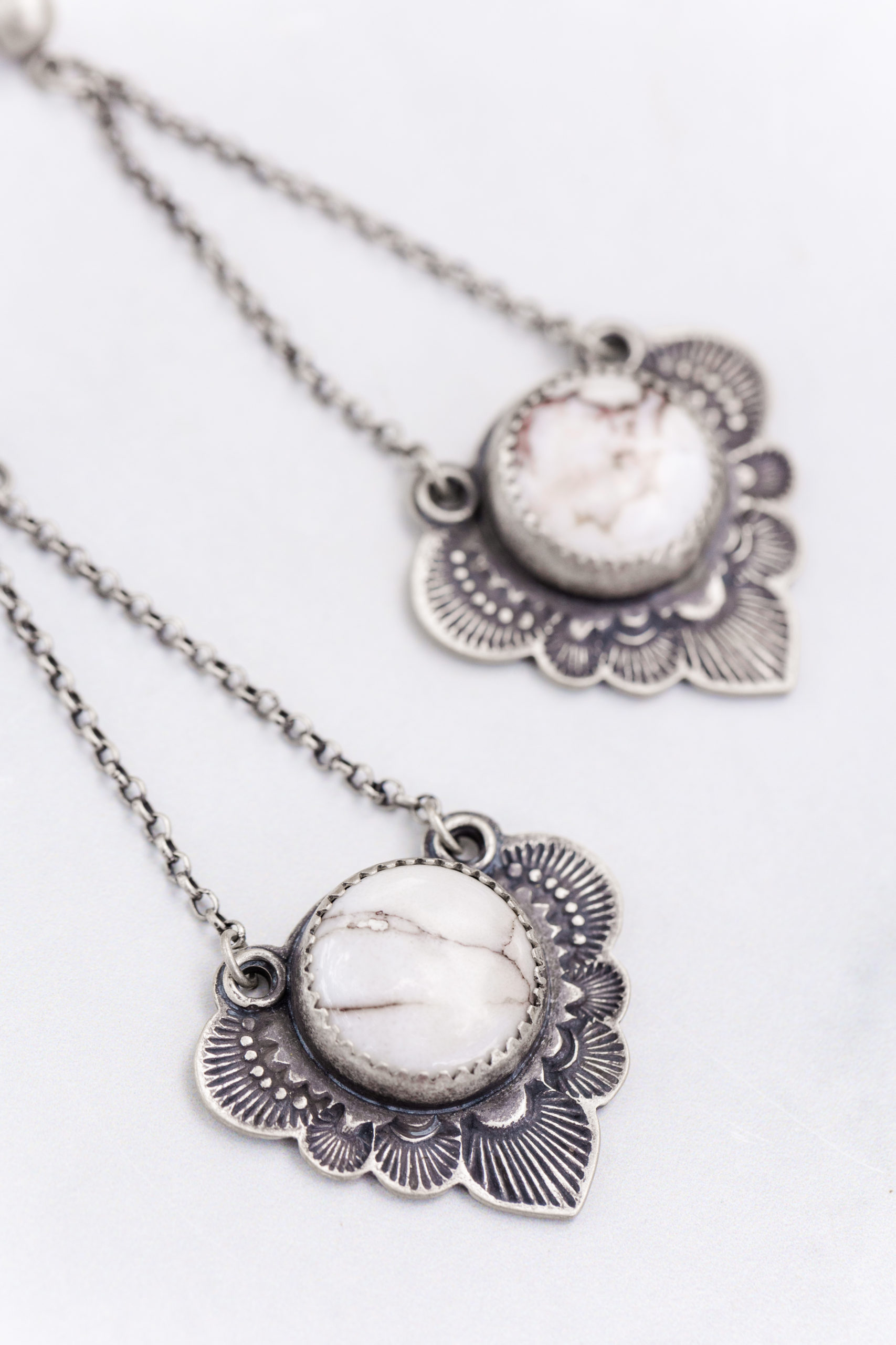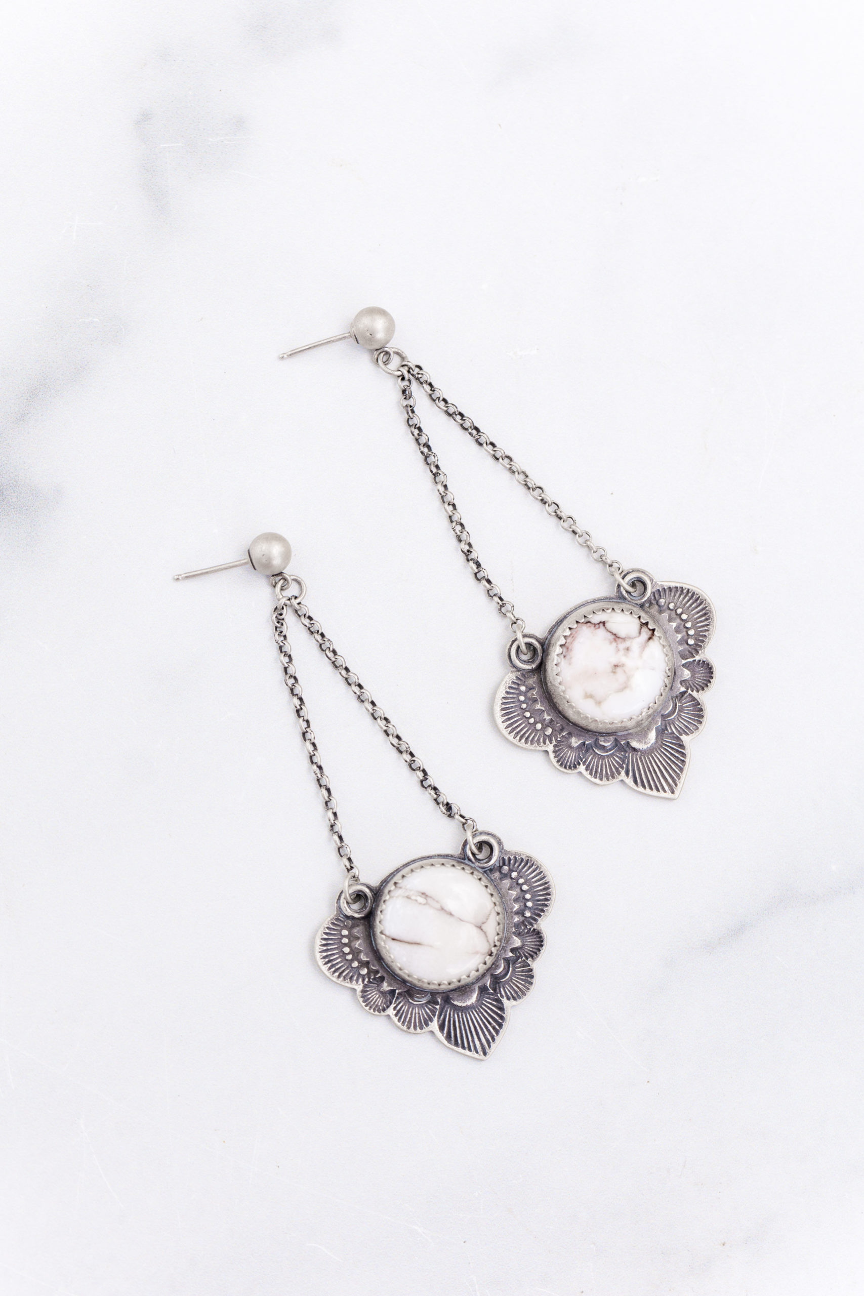 White Horse Magnesite stones surrounded by handstamped detailed and scalloped edges. They hang from chain and sturdy ball studs for an overall pendant effect. They’re 2 3/4″ long from the stud to the tip of the pendant. They come with extra wide earring backs to support the weight of earring but they are not visible from the front of the lobe.