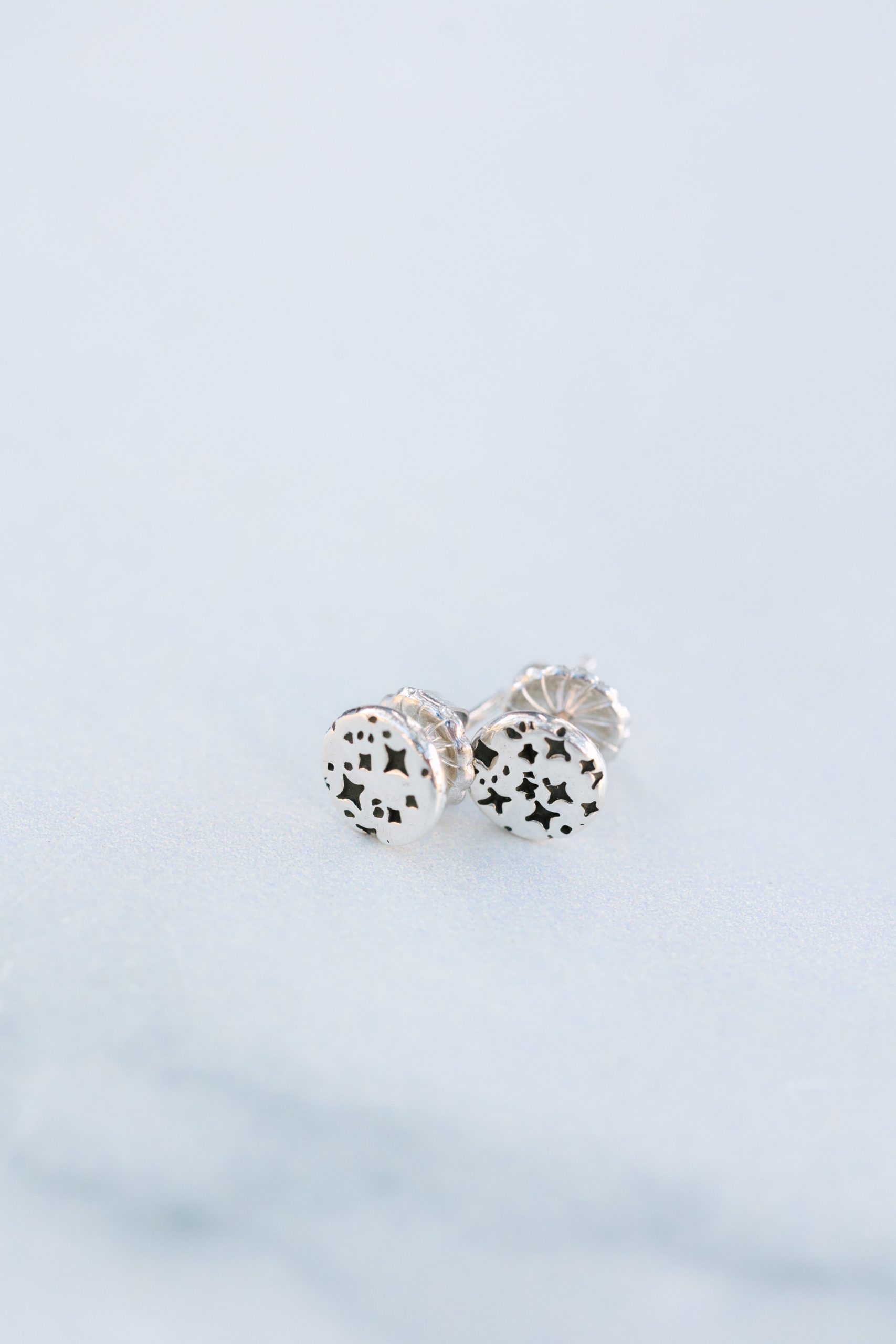 These sterling studs are hand stamped with a tiny galaxy of stars and then polished to a high shine. They come with extra large backs for secure all day wear.