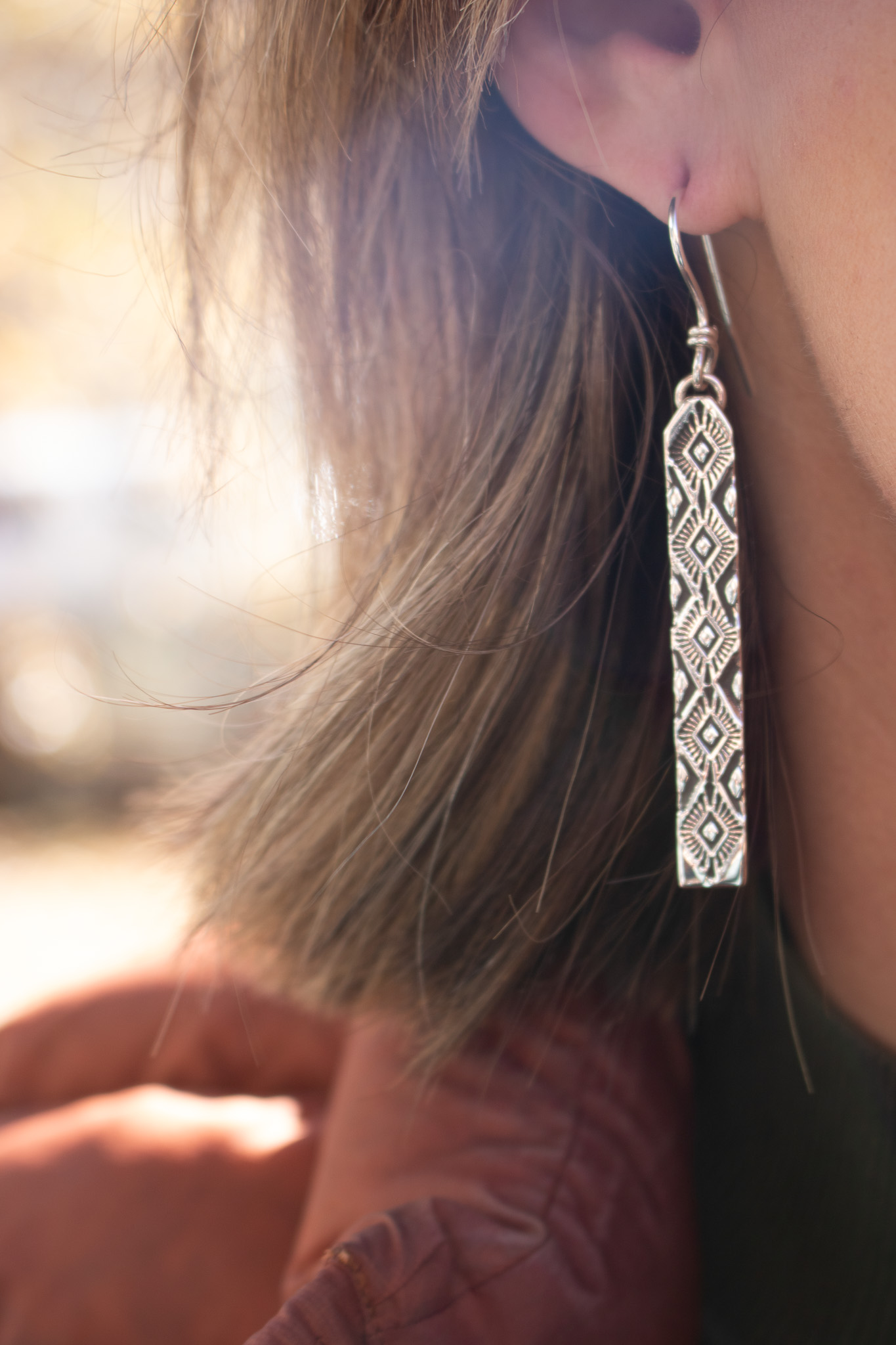 Like most southwestern babes, I love to wear a variety of earrings. They are the perfect way to frame you face and put a finishing touch on any fit. These sterling silver bar earrings feature an oxidized stamped diamond pattern with a high shine finish.