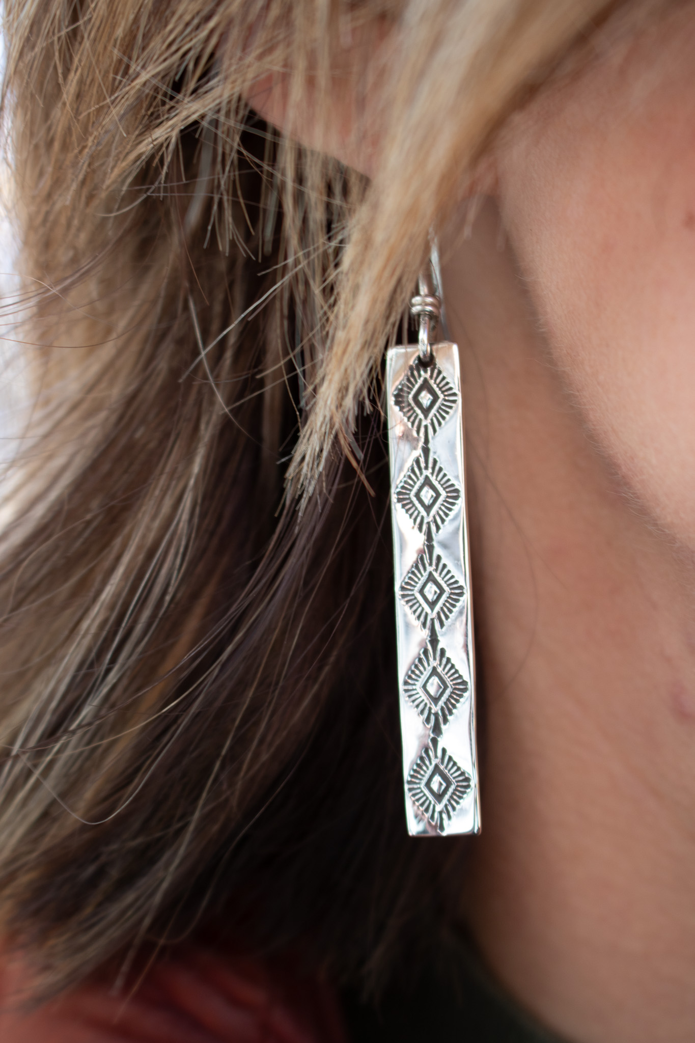 Like most southwestern babes, I love to wear a variety of earrings. They are the perfect way to frame you face and put a finishing touch on any fit. These sterling silver bar earrings feature an oxidized stamped diamond pattern with a high shine finish.