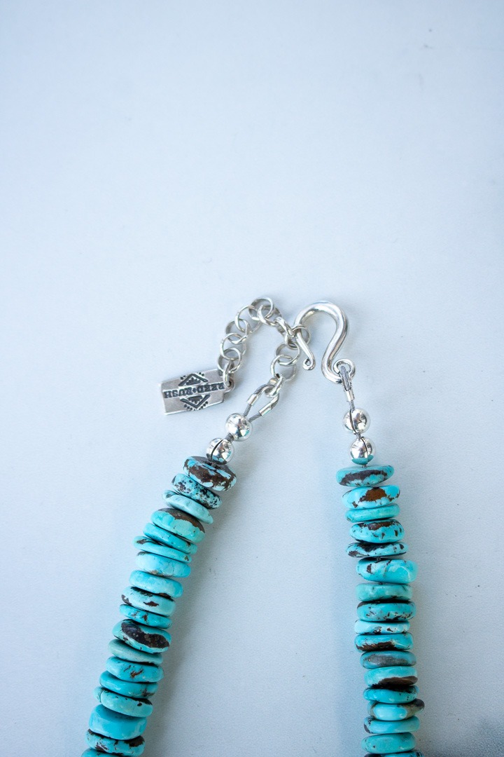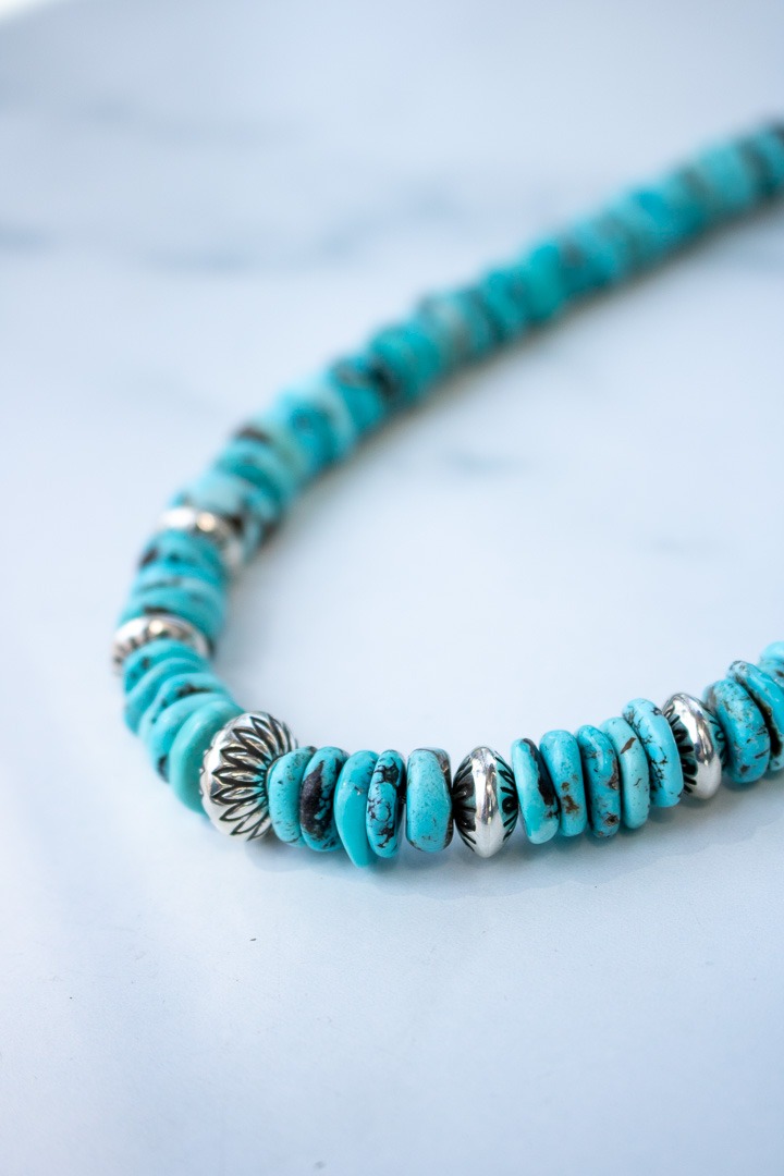 For this statement necklace, I handcrafted the beads and paired them with gorgeous sky blue turquoise. All silver components are polished to a high shine and the beads have been oxidized to display the stamp work. The necklace is 18.5″ long plus a 2″ extender and includes a sterling silver s-hoop clasp.