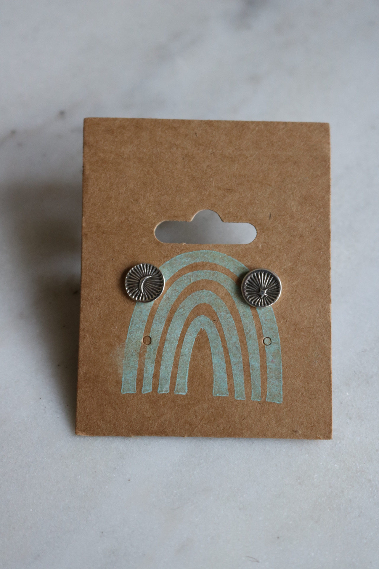 A perfectly mismatched set of studs, one with a star burst and the other with a shining moon. All components are made from sterling silver.