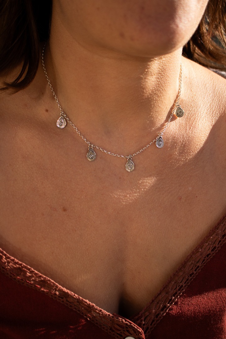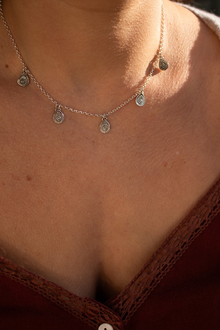 We all love a simple piece that’s perfect for warmer weather. This delicate necklace is the perfect accent to any sundress or tank top and works well alone or with other necklaces for a layered look. It features 5 handcrafted mandala inspired teardrops on a 2mm oval rolo chain and a stamped marker’s mark tag.