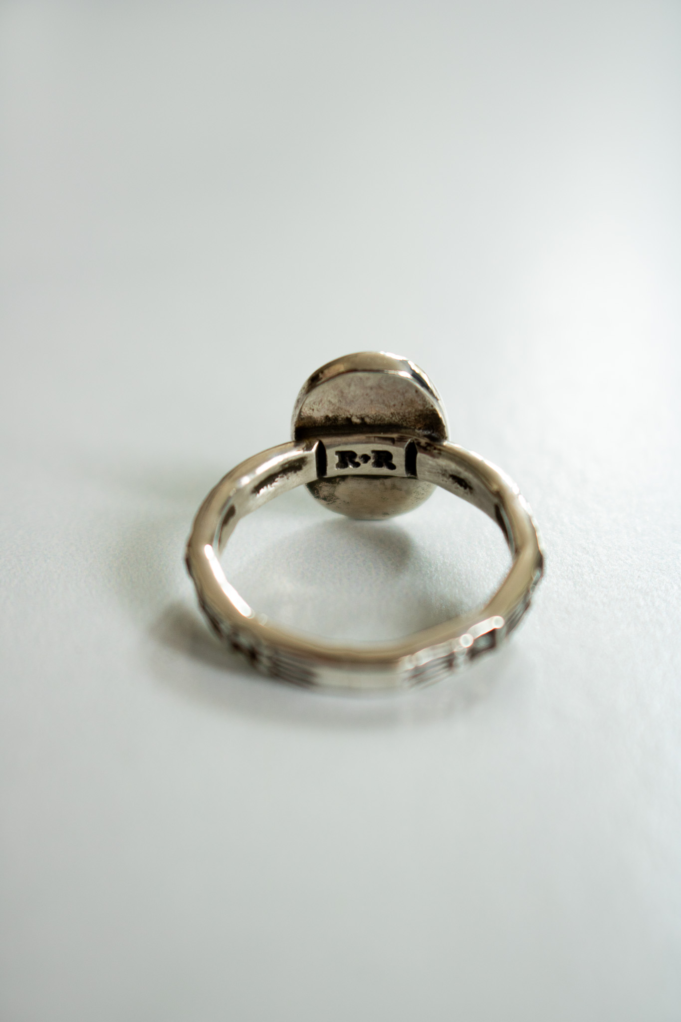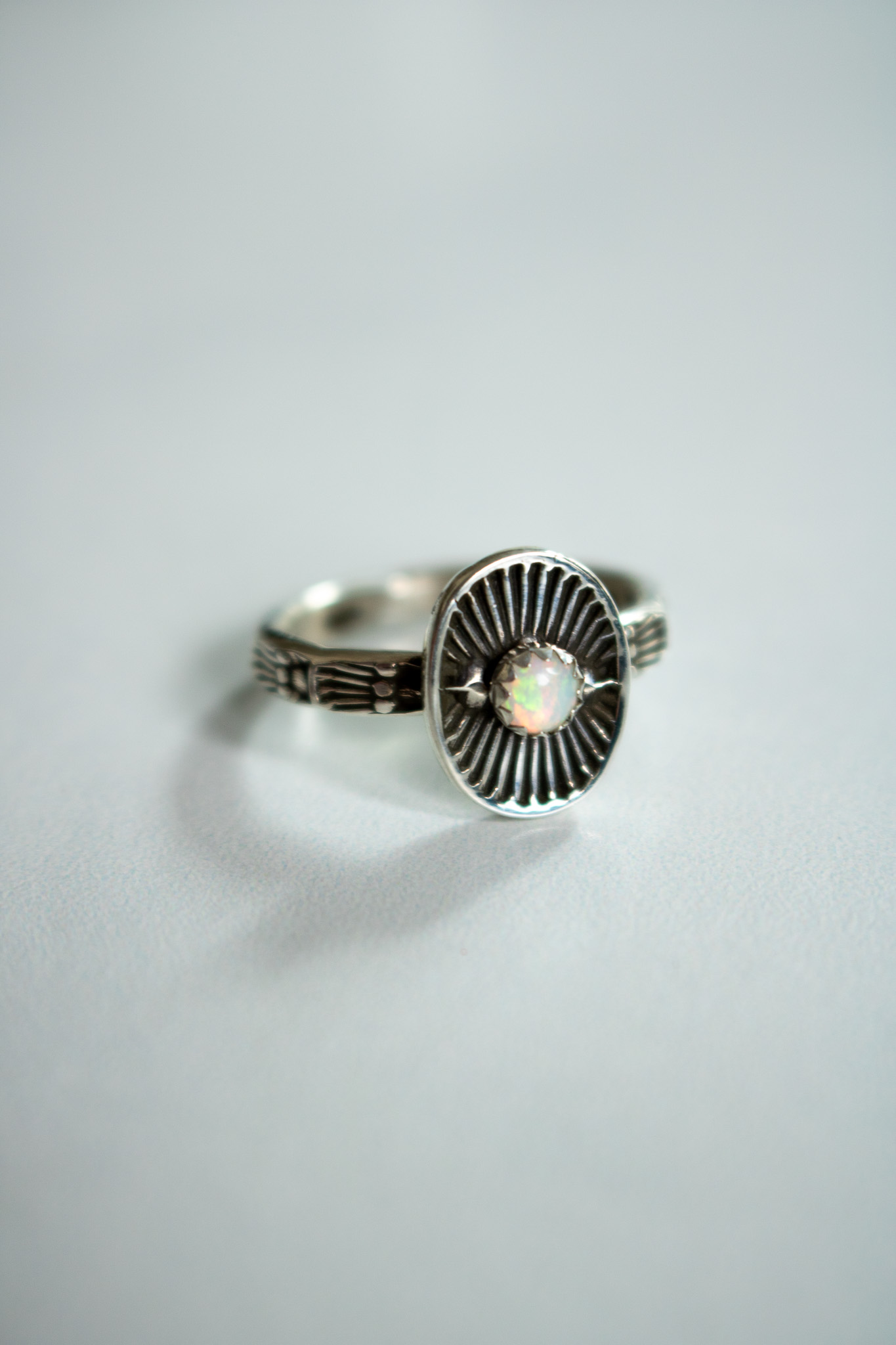 Lucky charm rings started as a joyful side quest one winter afternoon when I let my mind wonder and my creativity steer the ship. The central pendant starts as sterling silver scrap that I melt down and reform into sheet. I then hand stamp it, saw it out and then solder it to a stamped sterling stacker band. This one is topped with an Ethiopian Opal, then oxidized and given a high shine polish.