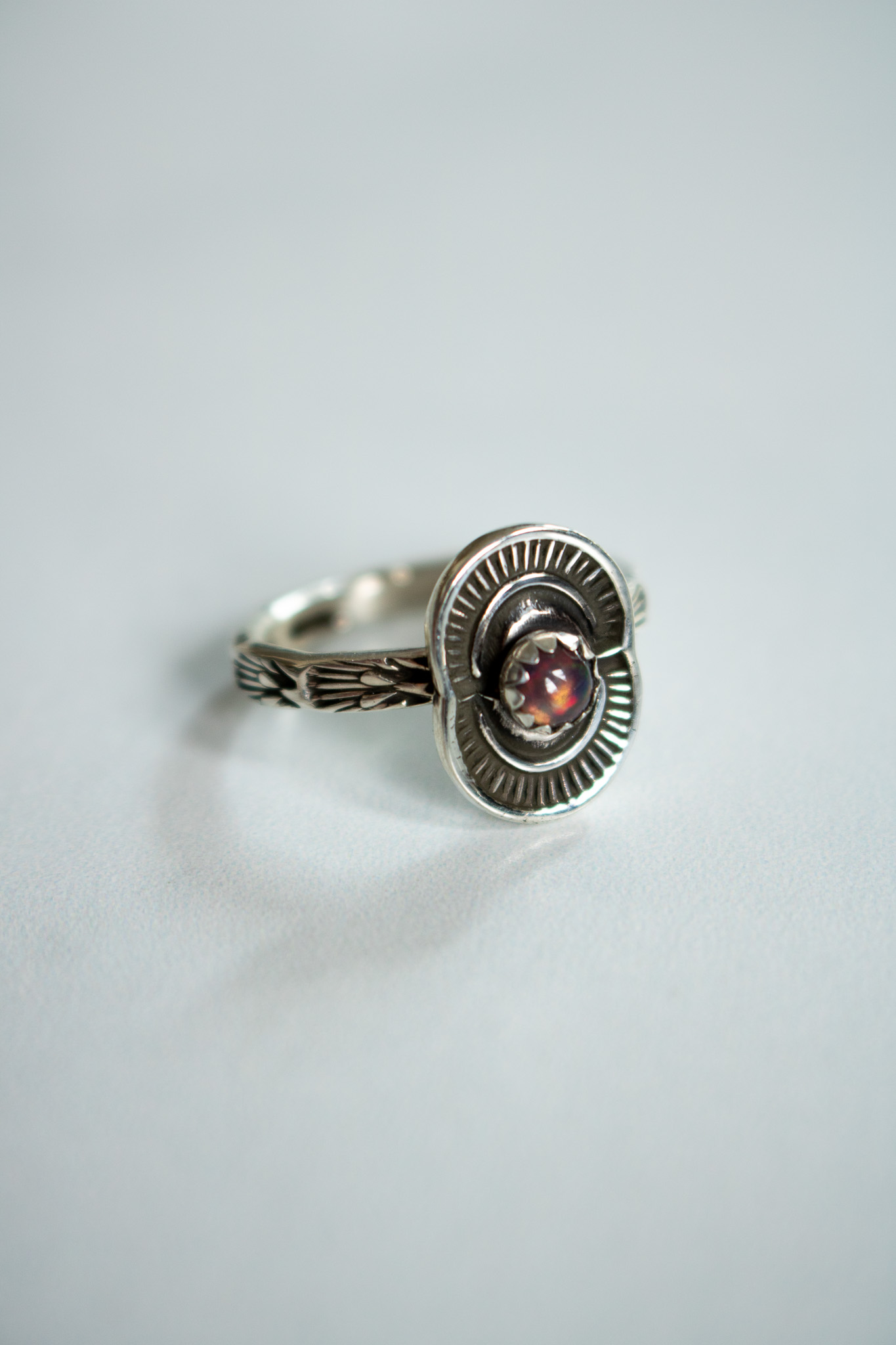 Lucky charm rings started as a joyful side quest one winter afternoon when I let my mind wonder and my creativity steer the ship. The central pendant starts as sterling silver scrap that I melt down and reform into sheet. I then hand stamp it, saw it out and then solder it to a stamped sterling stacker band. This one is topped with a black Ethiopian Opal, then oxidized and given a high shine polish.