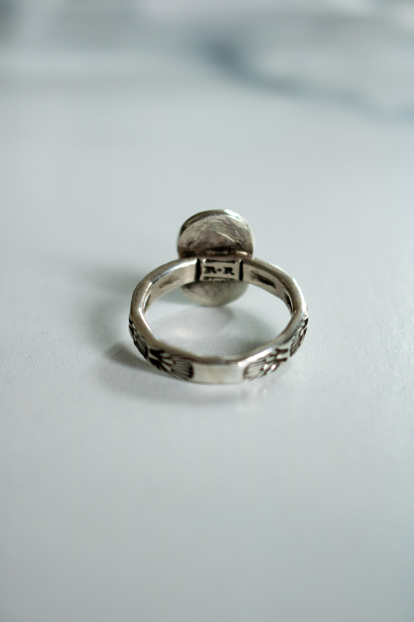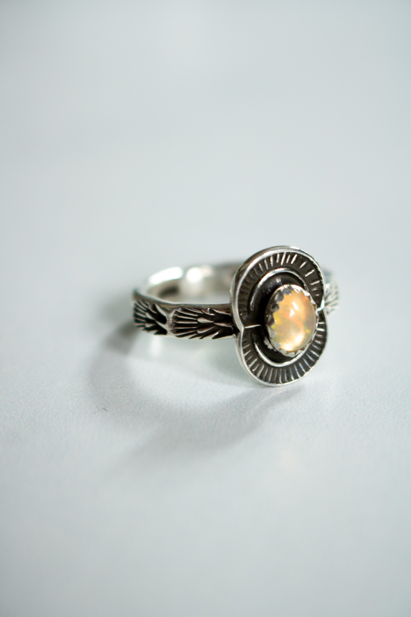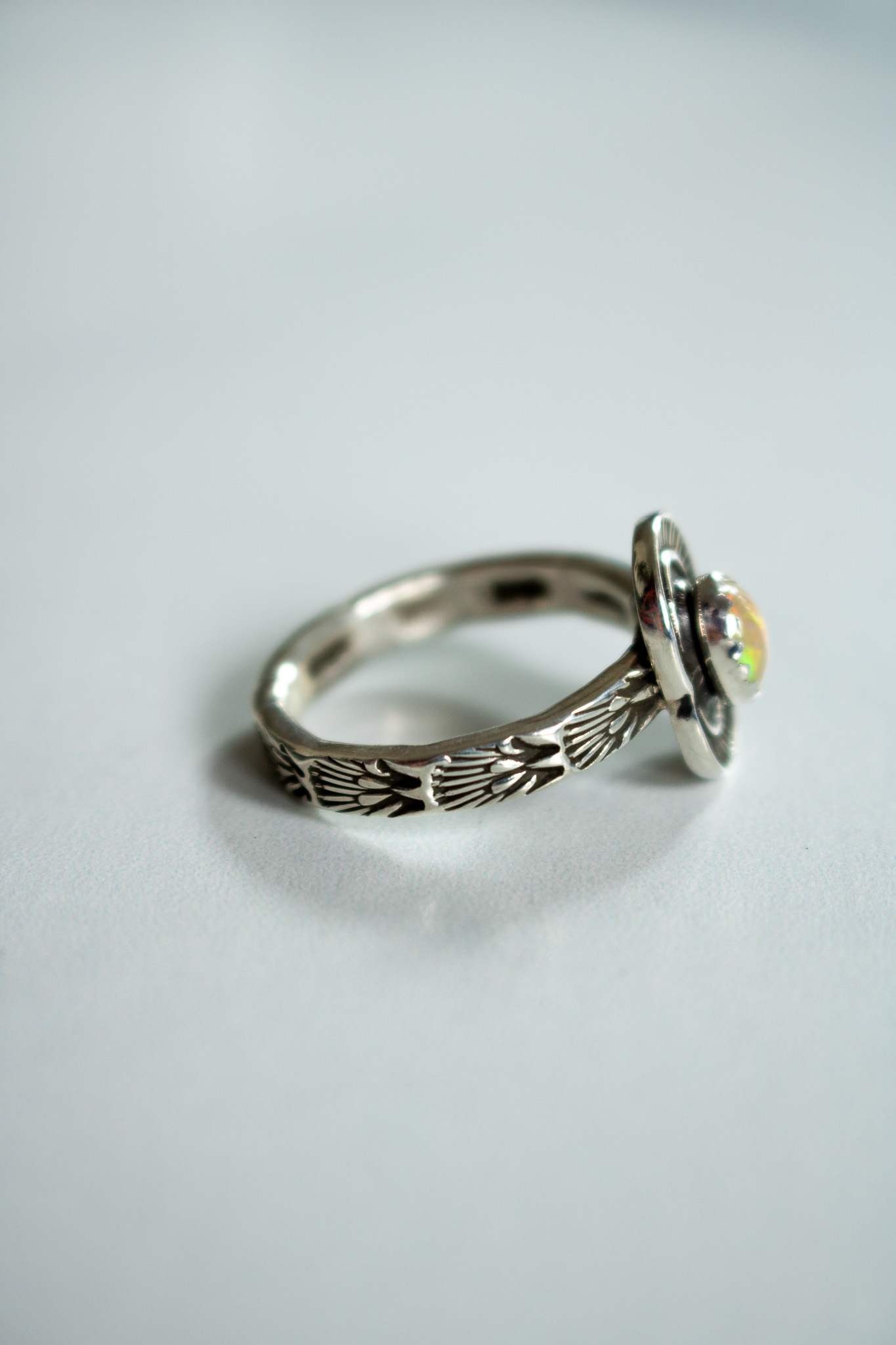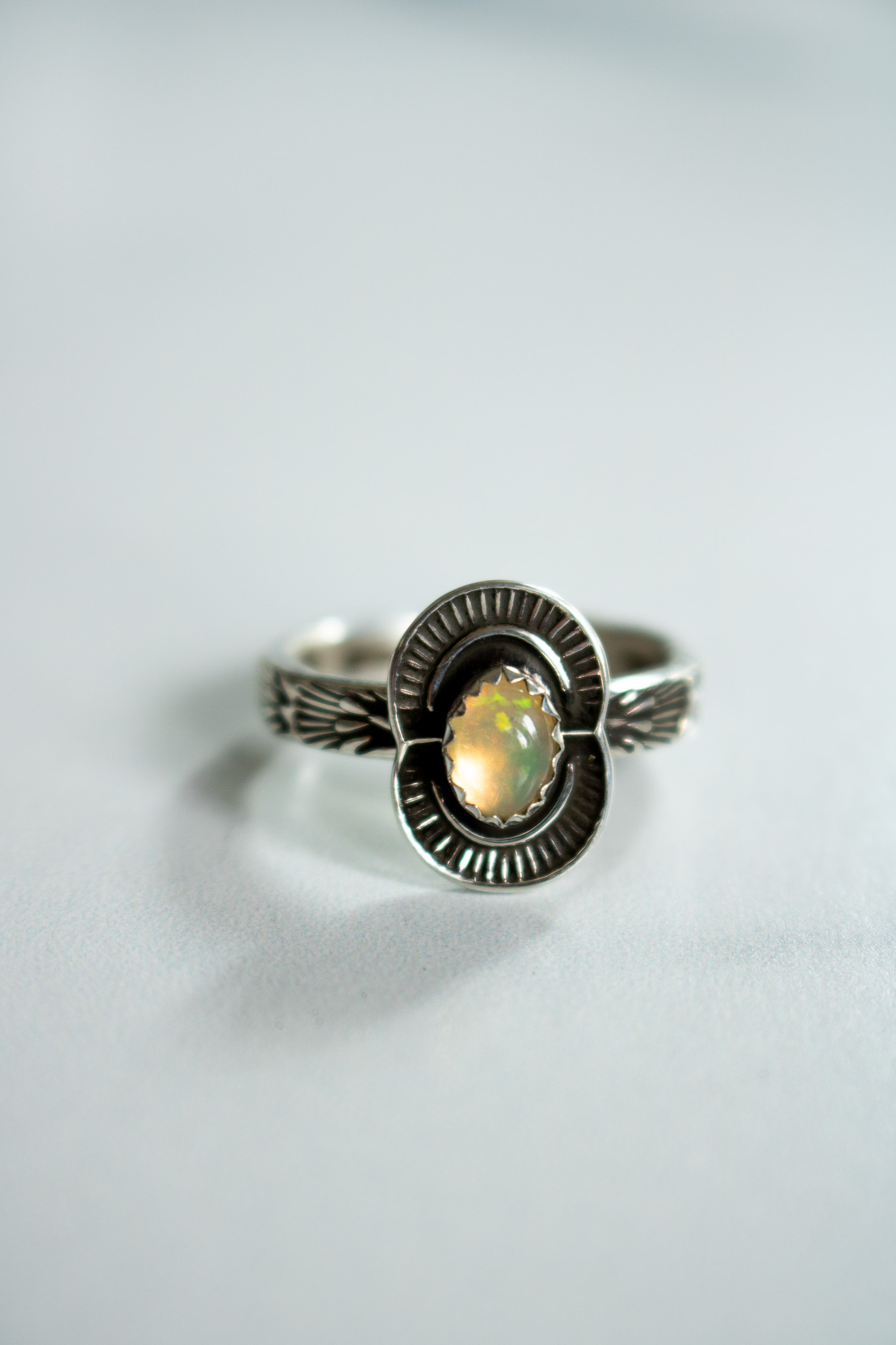 Lucky charm rings started as a joyful side quest one winter afternoon when I let my mind wonder and my creativity steer the ship. The central pendant starts as sterling silver scrap that I melt down and reform into sheet. I then hand stamp it, saw it out and then solder it to a stamped sterling stacker band. This one is topped with an Ethiopian Opal, then oxidized and given a high shine polish.