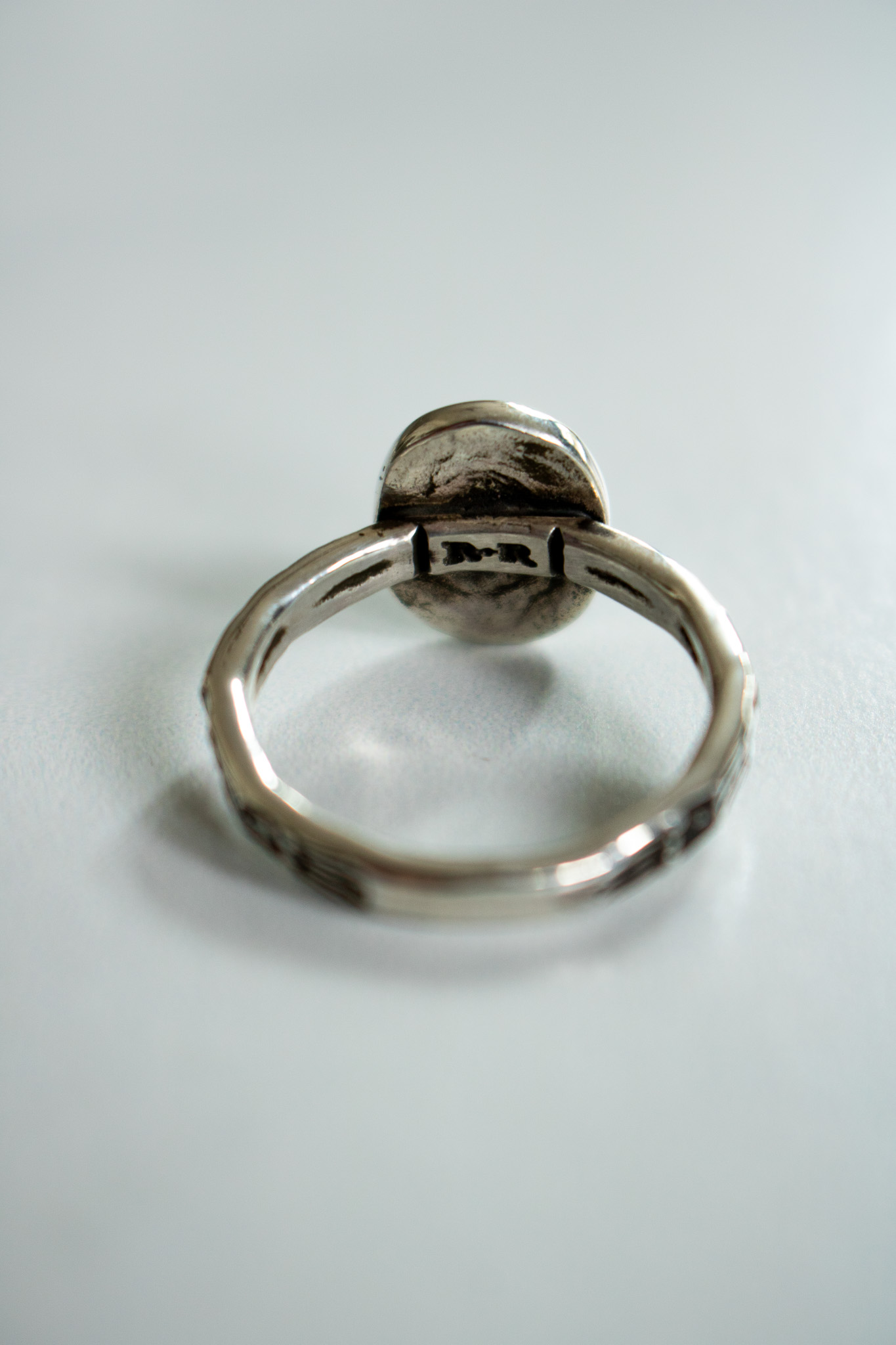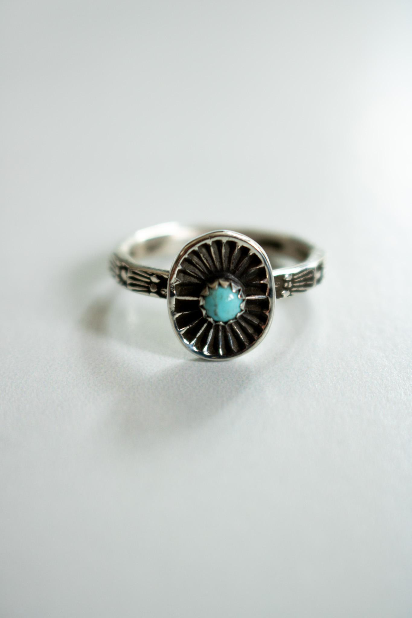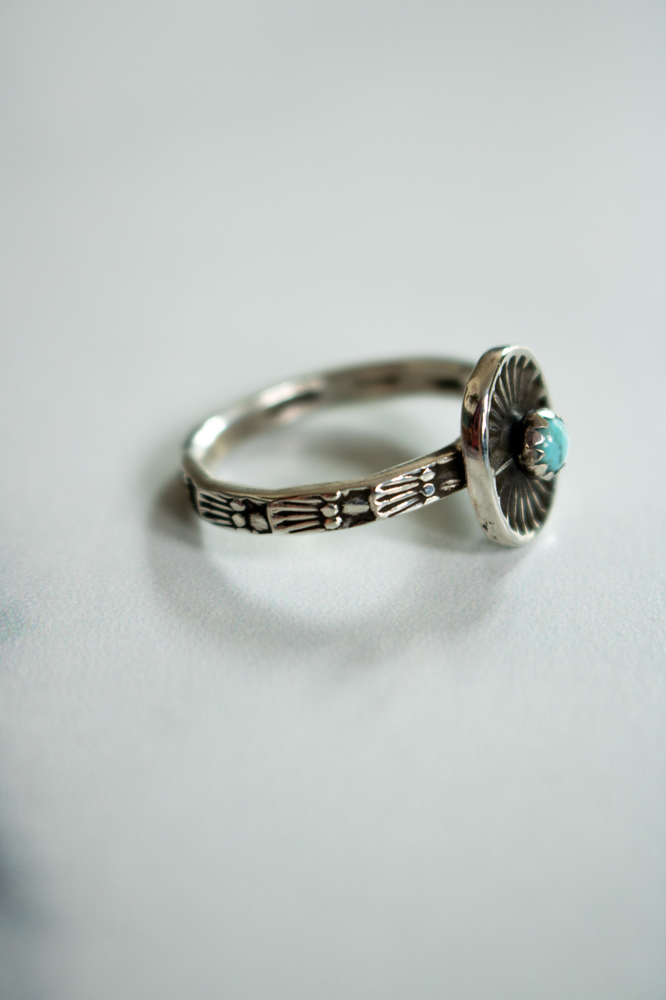 Lucky charm rings started as a joyful side quest one winter afternoon when I let my mind wonder and my creativity steer the ship. The central pendant starts as sterling silver scrap that I melt down and reform into sheet. I then hand stamp it, saw it out and then solder it to a stamped sterling stacker band. This one is topped with a Kingman turquoise, then oxidized and given a high shine polish.