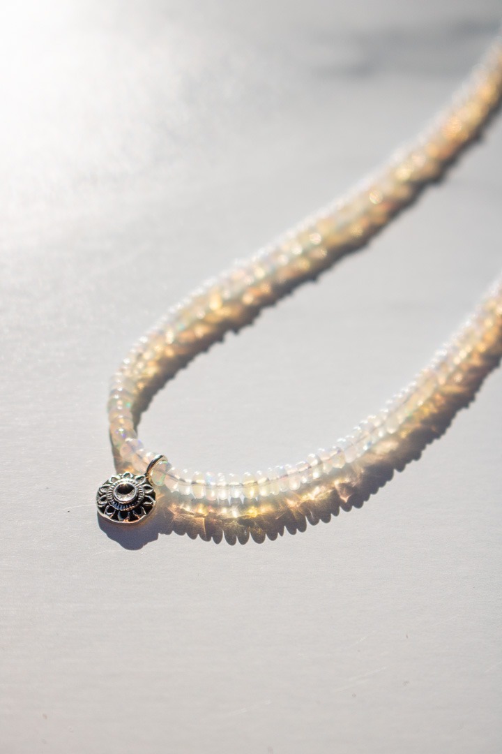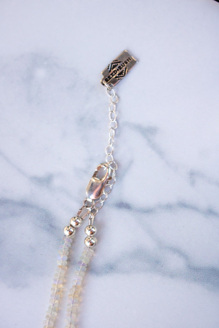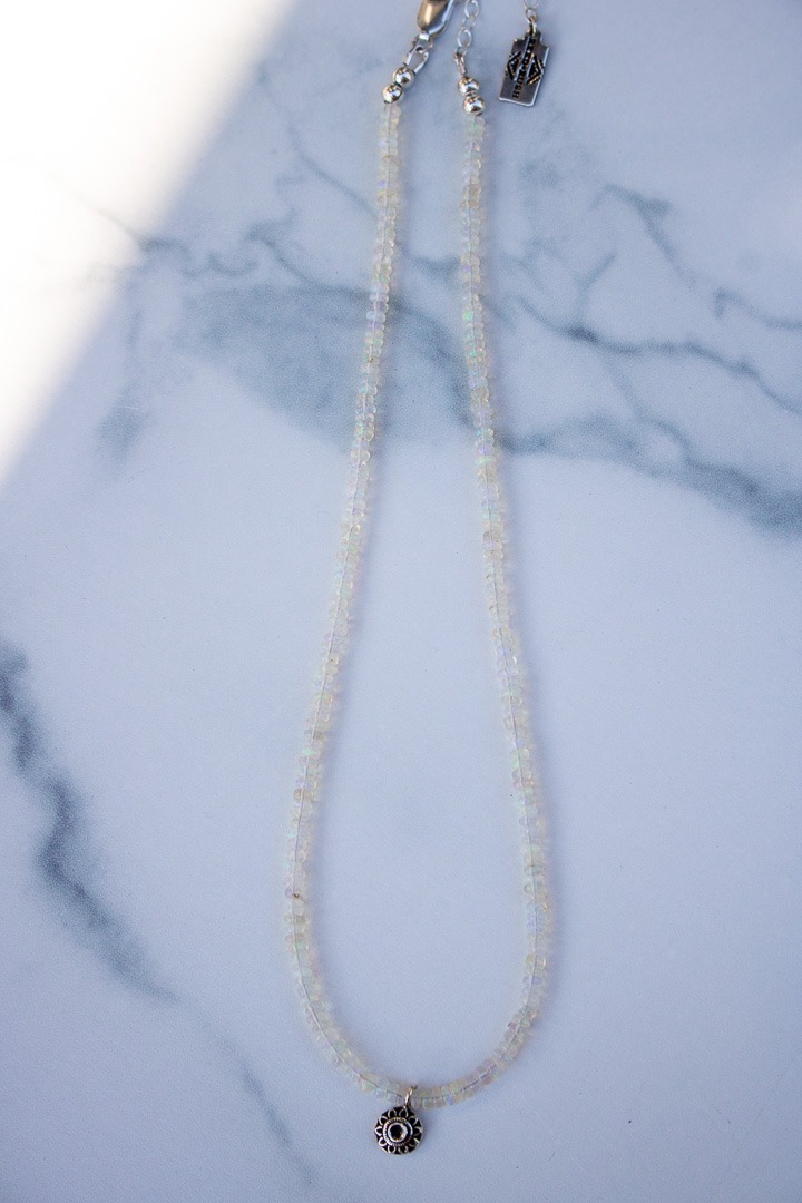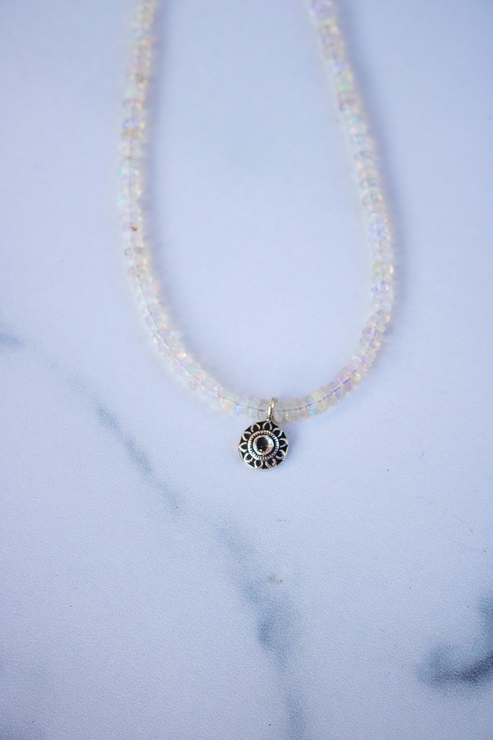 As a 80’s baby, I was wrapped in all things Liza Frank and Rainbow Brite. As such, rainbow filled opal beads have a special place in my heart and this design checks all the boxes. This one is composed 15″ of natural Ethiopian Opal beads and a single hand formed sterling sundance charm made from recycled silver. It includes a 2″ sterling silver extender that makes it adjustable between 16-18″ and is finished with a signature R+R makers tag.