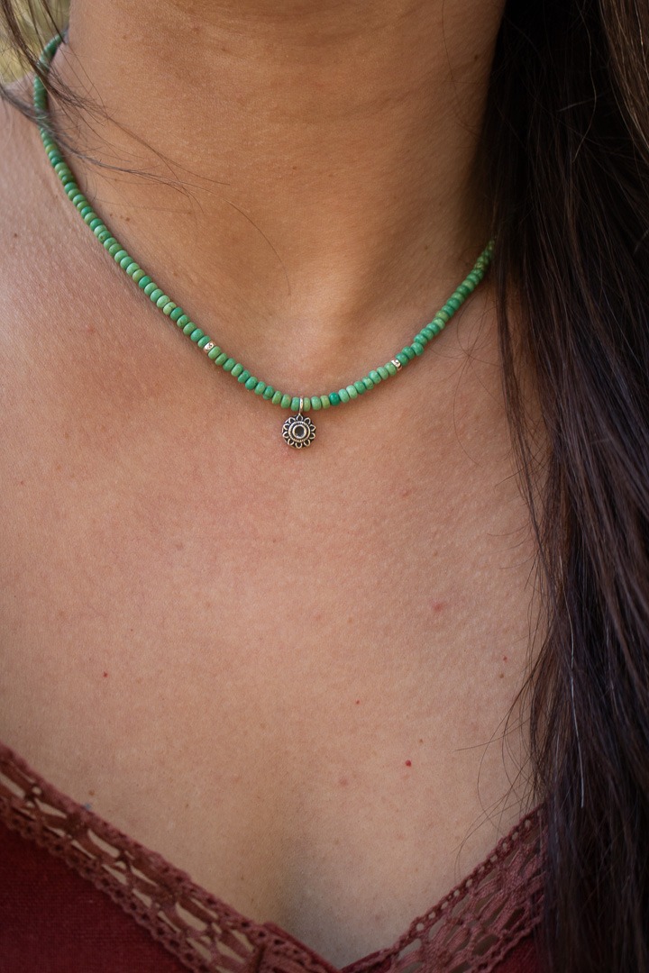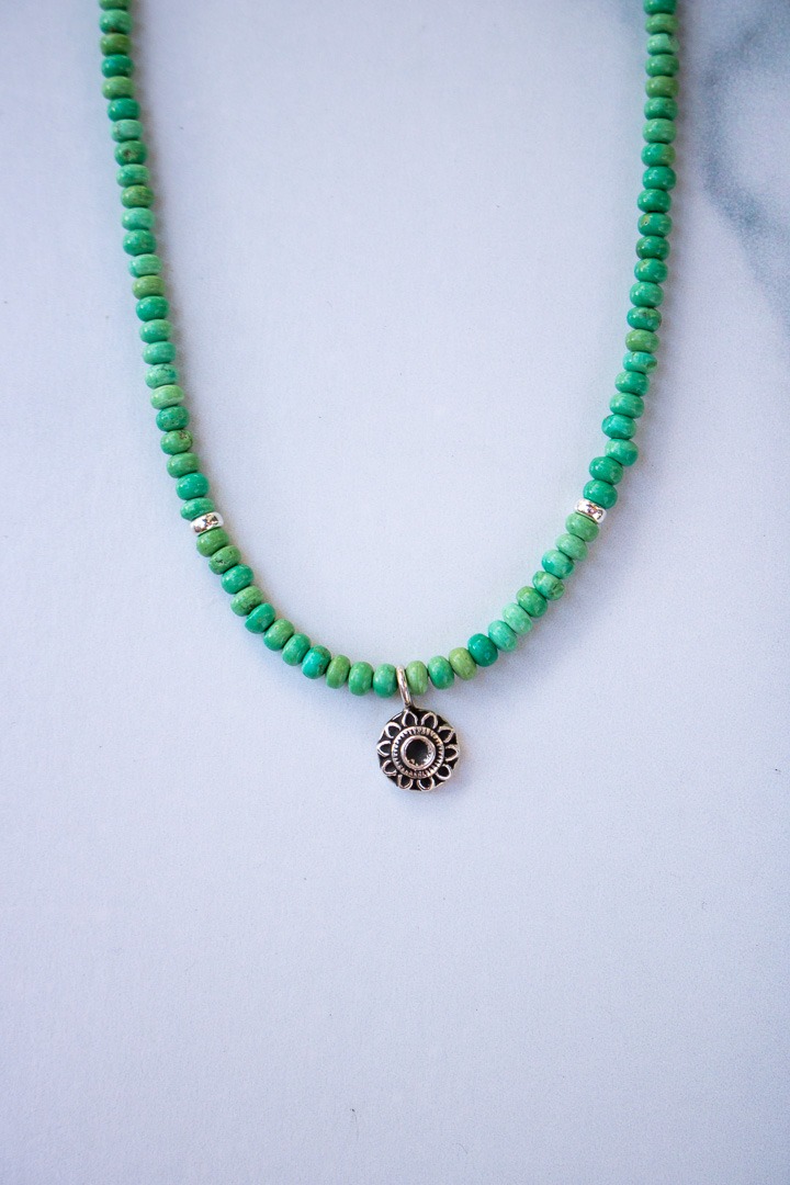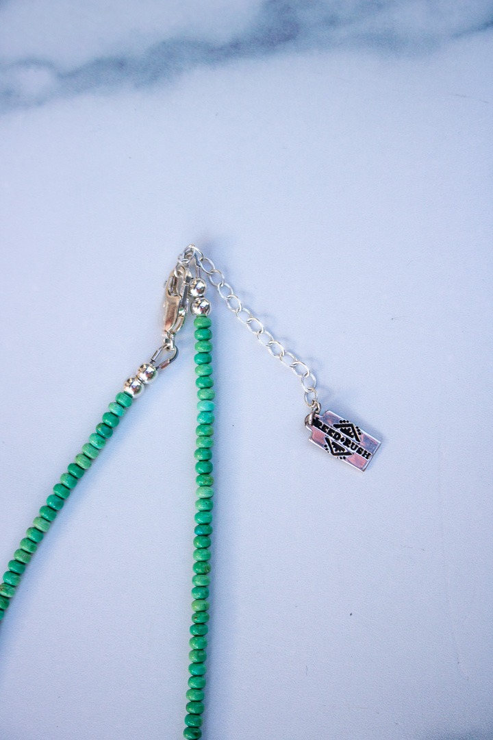 Turquoise is such an amazing material and beads are great way to showcase it. Chic, vibrant and stackable, this design checks all the boxes. This one is composed 15″ of natural Emerald Valley turquoise beads and a single hand formed sterling sundance charm made from recycled silver. It includes a 2″ sterling silver extender that makes it adjustable between 16-18″ and is finished with a signature R+R makers tag.