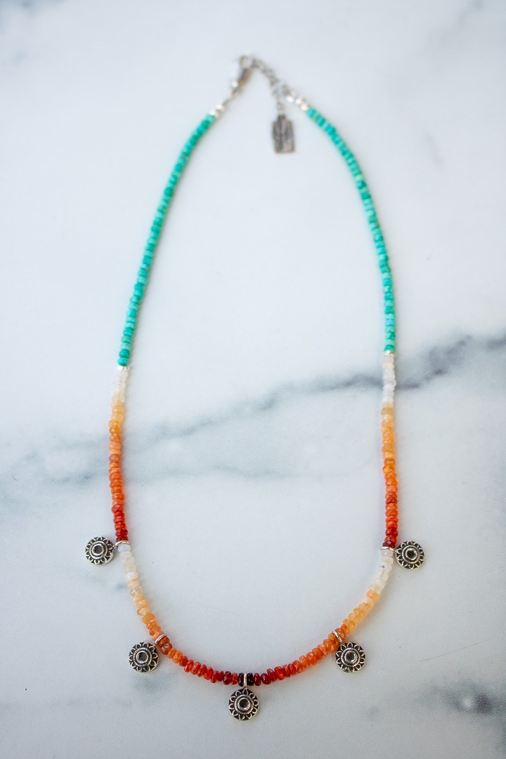 Every year something at the Tucson Gem show takes me by surprise and its love at first sight. This year, that thing was fire opal beads. While I’ve been setting fire opal stones in my work for years, I’d never seen the beads in person before. Their ombre pattern and warm glow were so undeniably Southwestern and I just adore them. To add even more Arizona charm, I combined the sun kissed fire opal with high grade Emerald Valley turquoise for the perfect balance of fire and earth. I topped it off with 5 handcrafted sundance charms to create one my favorite necklace designs ever.