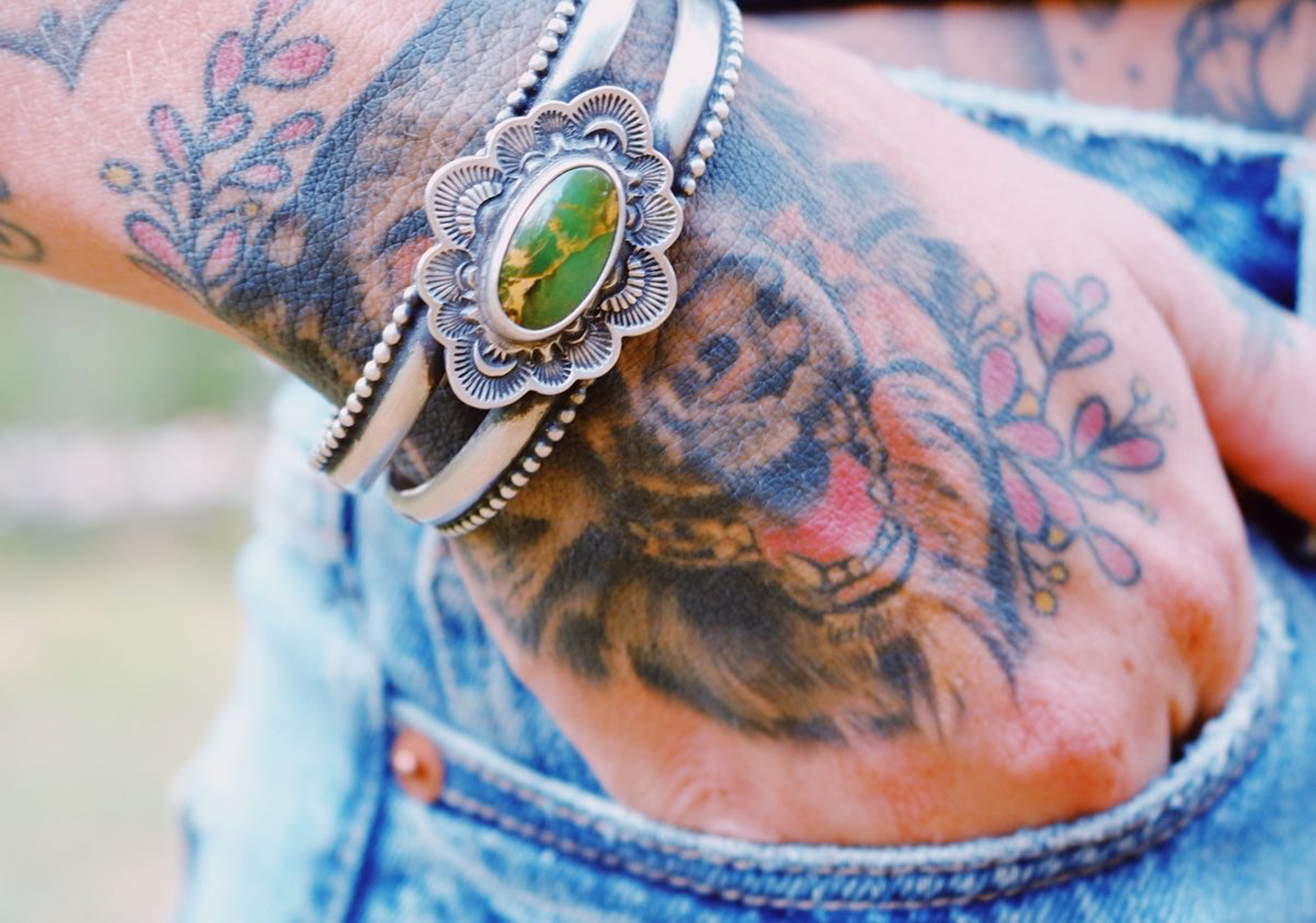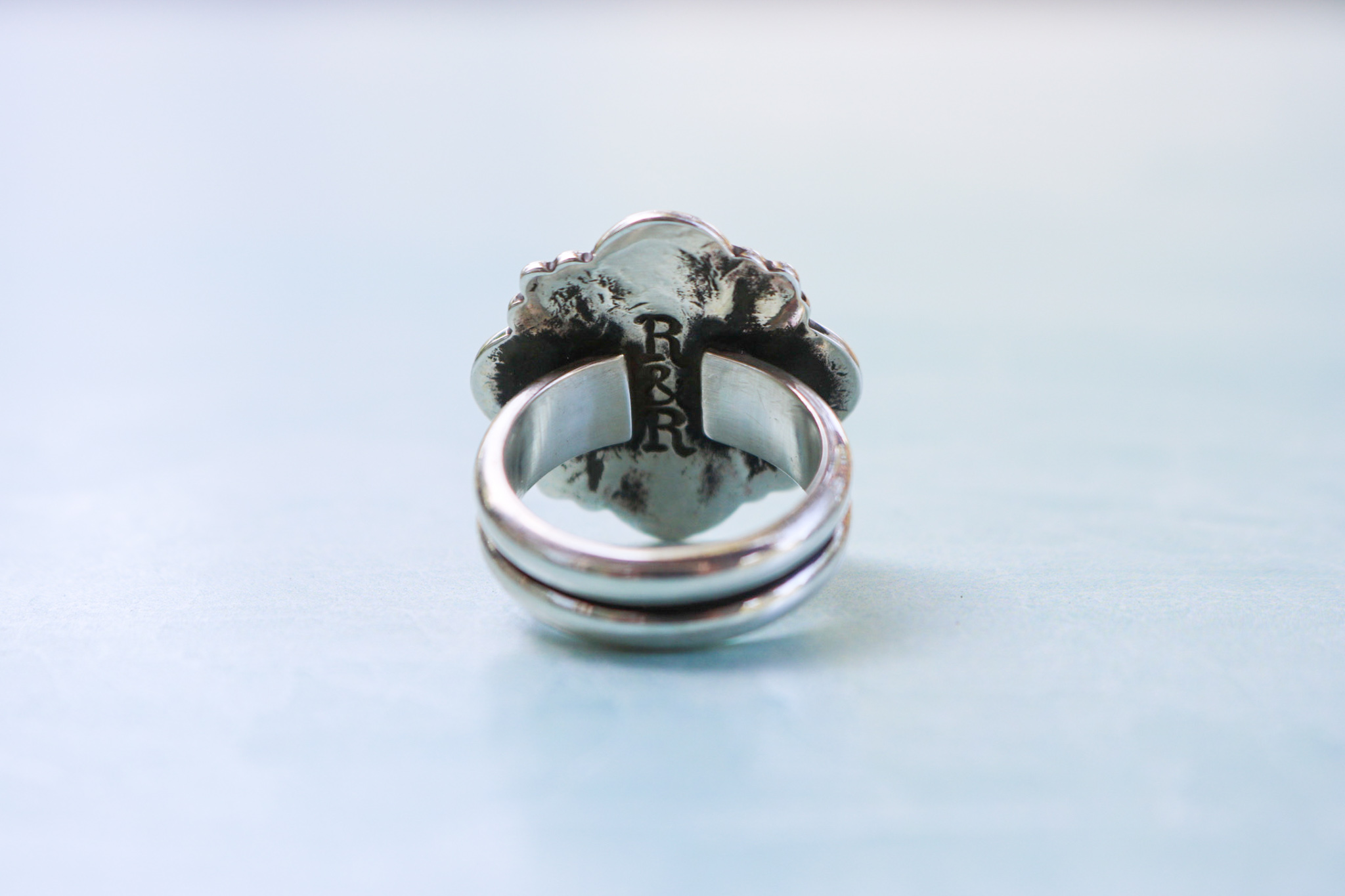 Olive green tourmaline surrounded by hand stamped sterling silver and a handcrafted scalloped edge. Given an R&R makers mark on the inside and set on a double half round ring shank. Oxidized to highlight the details and finished with a high shine polish. The ring measures at a size 7 3/4 but fits slightly smaller due to the wide band. It cannot be resized.