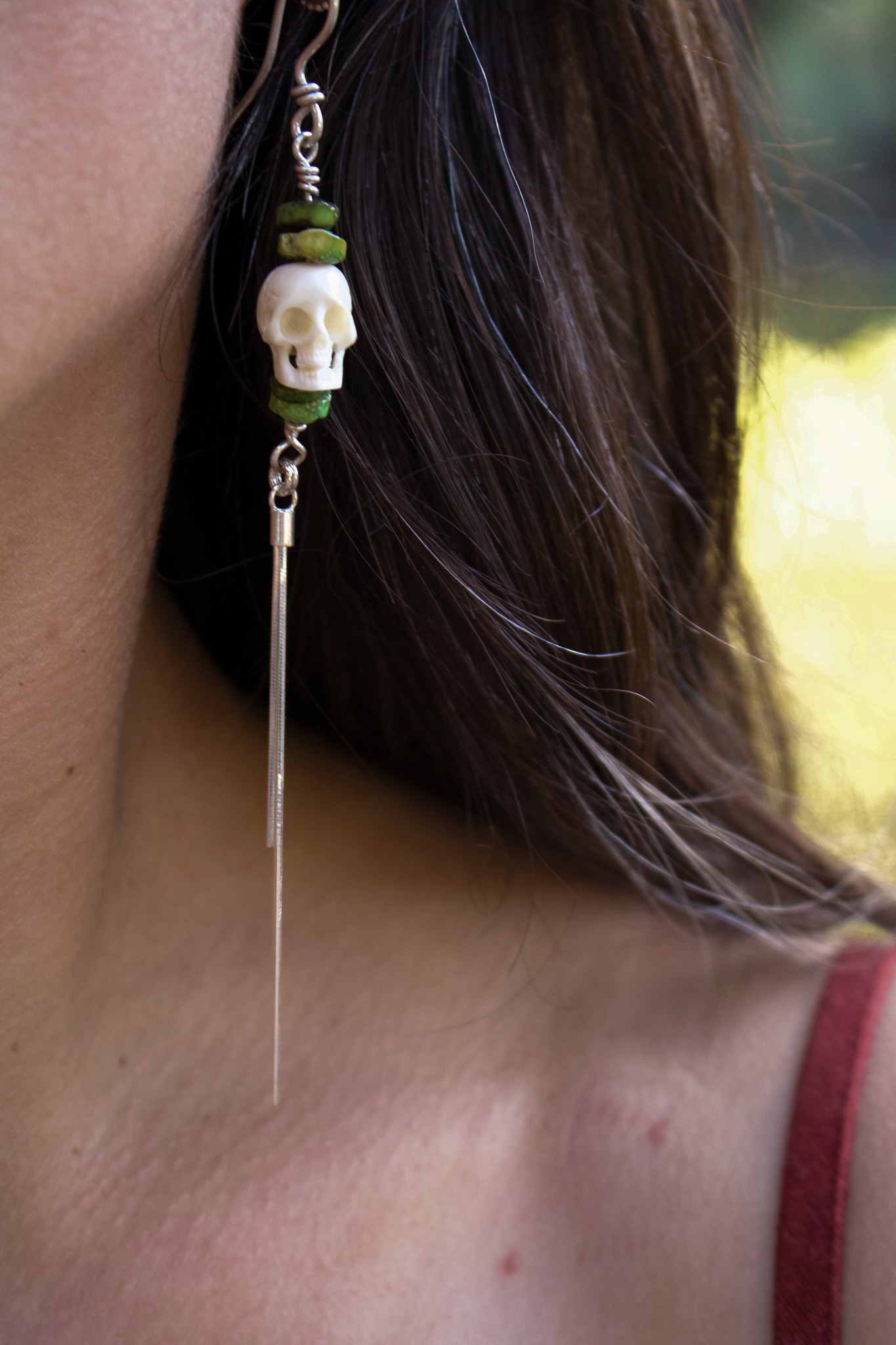 What’s more perfect for a Southwestern Halloween than skulls and Sonoran Gold Turquoise? These lightweight fringe earrings feature a small skull carved from cow bone hung between 4 handcut Sonoran Gold beads.