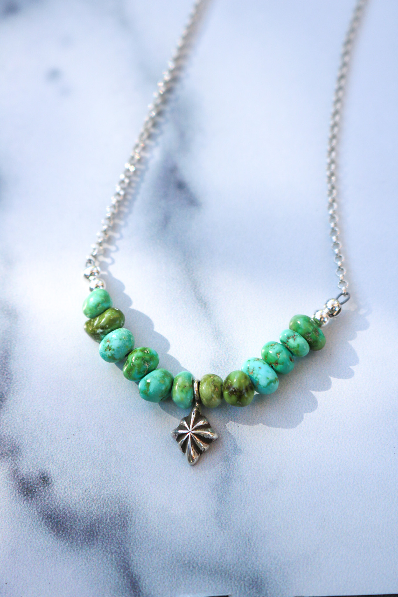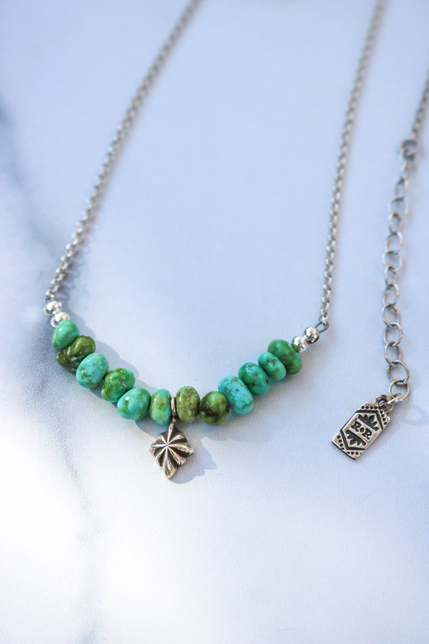 Since I started making them this summer, this necklace has between one of my daily drivers. Its composed of 2” natural Sonoran Gold turquoise beads, a single hand formed sterling diamond charm made from recycled silver and a 2mm sterling rolo chain. It includes a 2″ sterling silver extender that makes it adjustable between 16-18″ and is finished with a signature R+R makers tag.