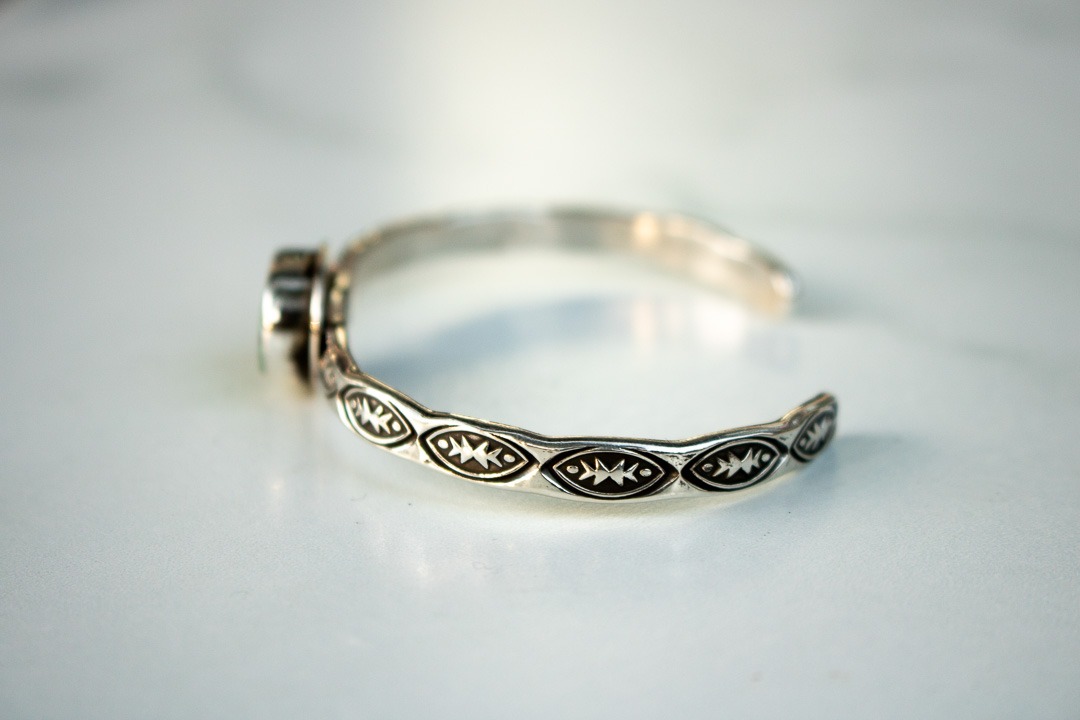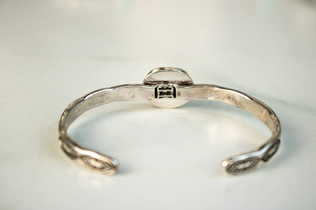 This cuff starts out as full round sterling wire that I hammer flat and then hand stamped, including an R+R markers mark inside the band. After its been shaped into a cuff, I solder the bezel for and set it with a gorgeous piece of Royston turquoise. Its then oxidized to highlight the detail and polished to a high shine.