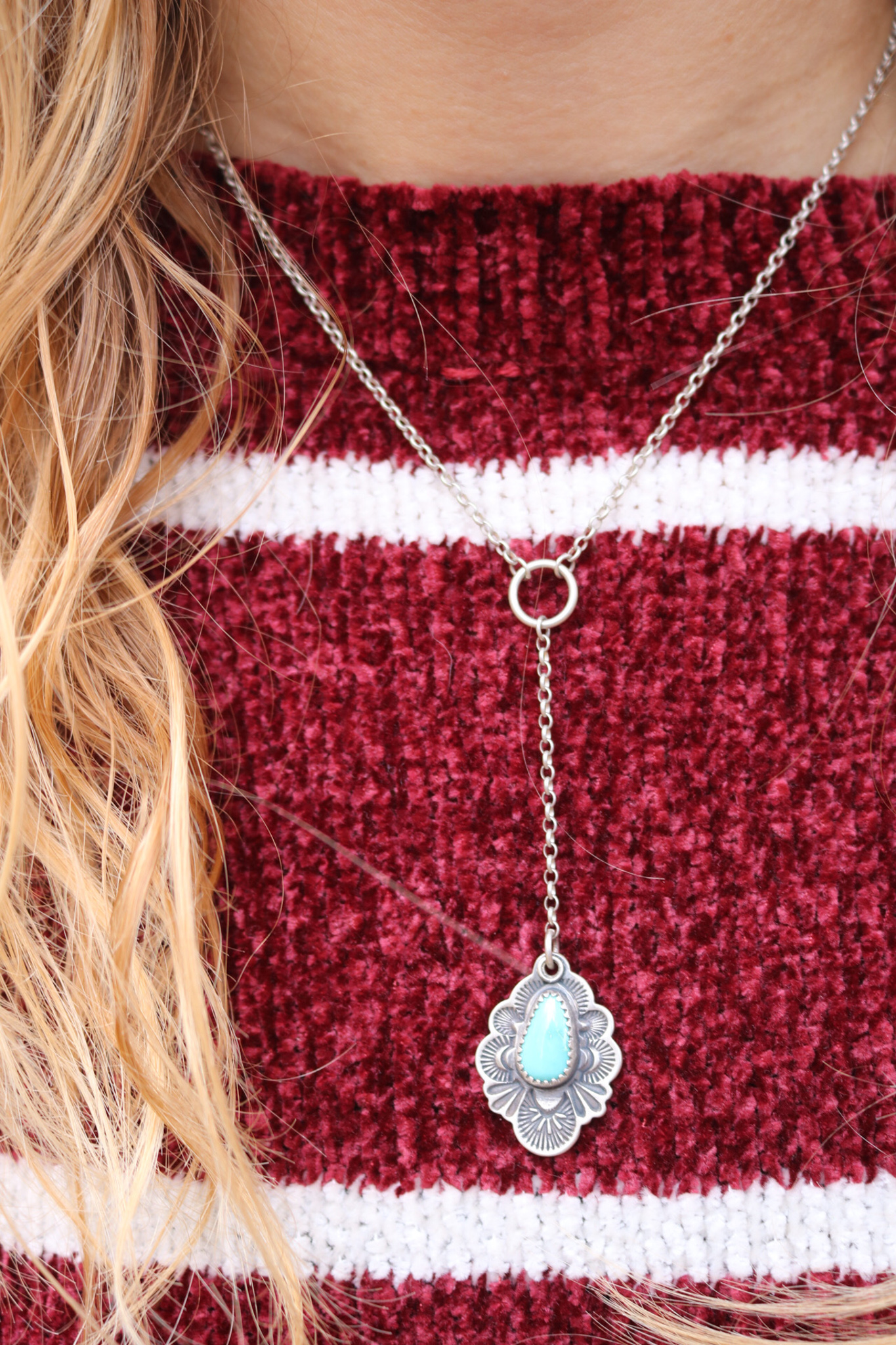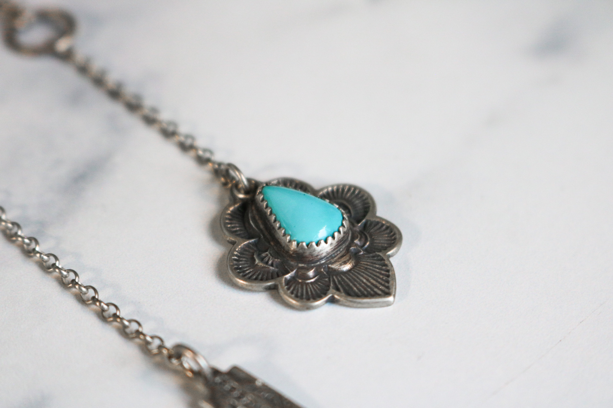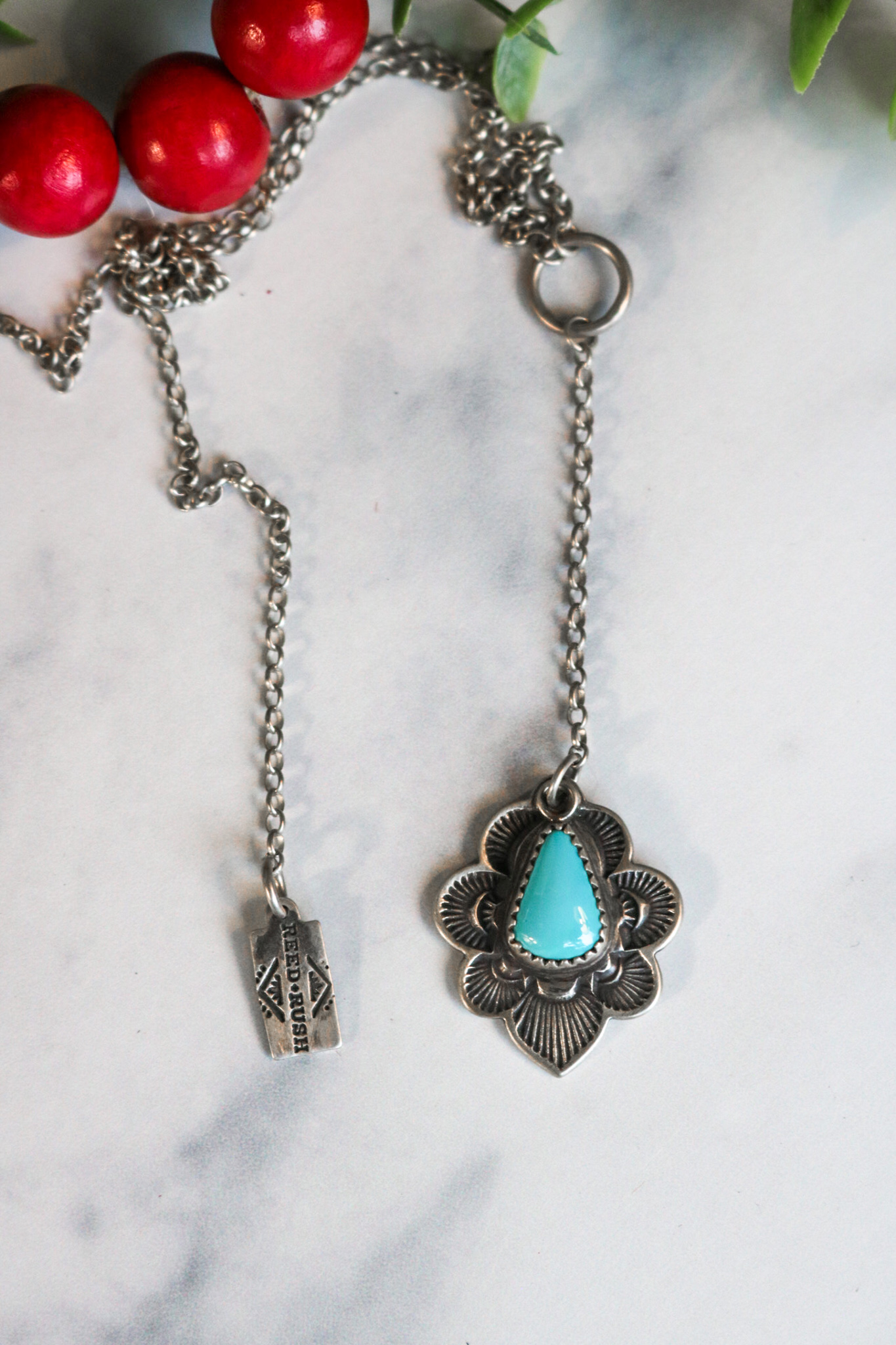 Vibrant Royston Turquoise surrounded by hand stamped sterling silver and a handcrafted scalloped edge. The pendant measures 1” long and hangs on a 1.5” inches from a sterling ring and the chain is 18″ long to the ring. Oxidized to highlight the details and finished with a brushed satin finish and given R&R makers mark at the clasp.