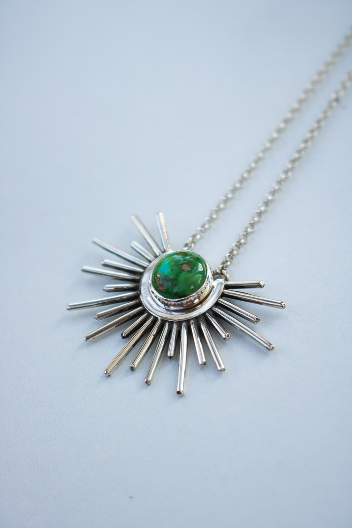 A hand-cut burst of sterling silver rays encircles a vivid piece of Sonoran Mountain Turquoise, like the sky holding the sun in its open palms. Each pendant is one of a kind, with its own distinct turquoise matrix and character. Strung on a sturdy 1.9mm sterling rolo chain with an adjustable length of 16–18 inches. Finished with a high-polish shine and my R+R signature tag — a mark of mountain-made craftsmanship.