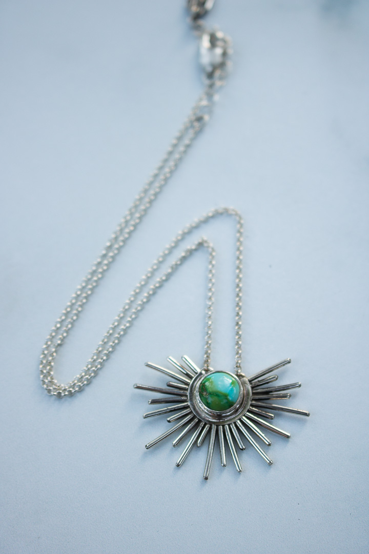 A hand-cut burst of sterling silver rays encircles a vivid piece of Sonoran Mountain Turquoise, like the sky holding the sun in its open palms. Each pendant is one of a kind, with its own distinct turquoise matrix and character. Strung on a sturdy 1.9mm sterling rolo chain with an adjustable length of 16–18 inches. Finished with a high-polish shine and my R+R signature tag — a mark of mountain-made craftsmanship.