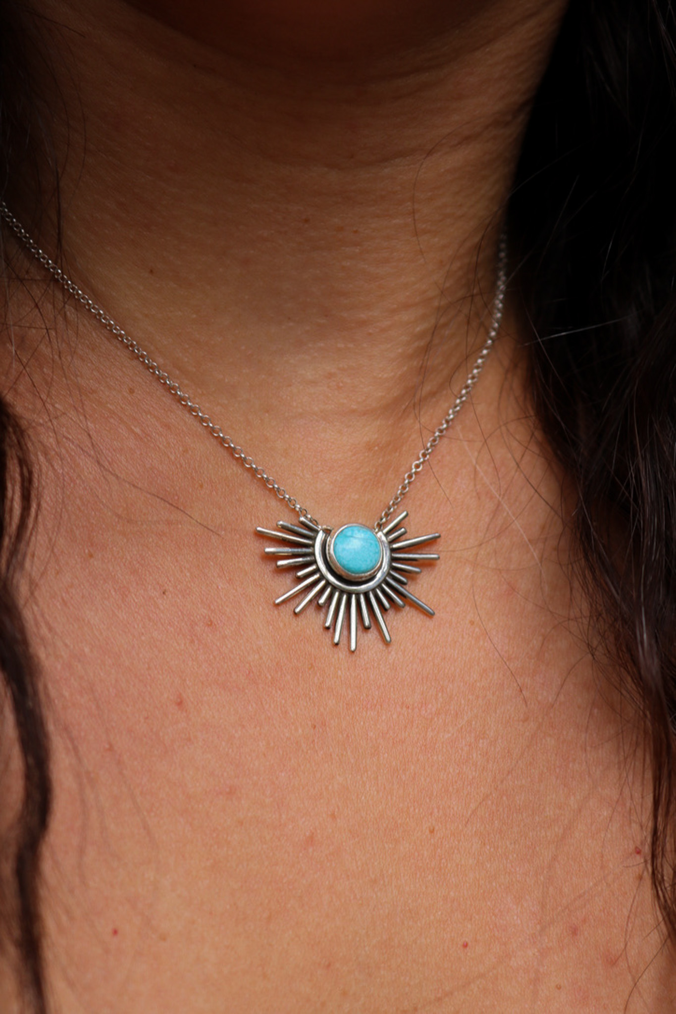 This pendant features tranquil White Water turquoise surrounded by brilliant, hand cut sterling rays. It’s hung from 2mm sterling silver rolo chain and the whole necklace measures 16-18″ long. Finished with a R+R signature tag and a high polish shine.