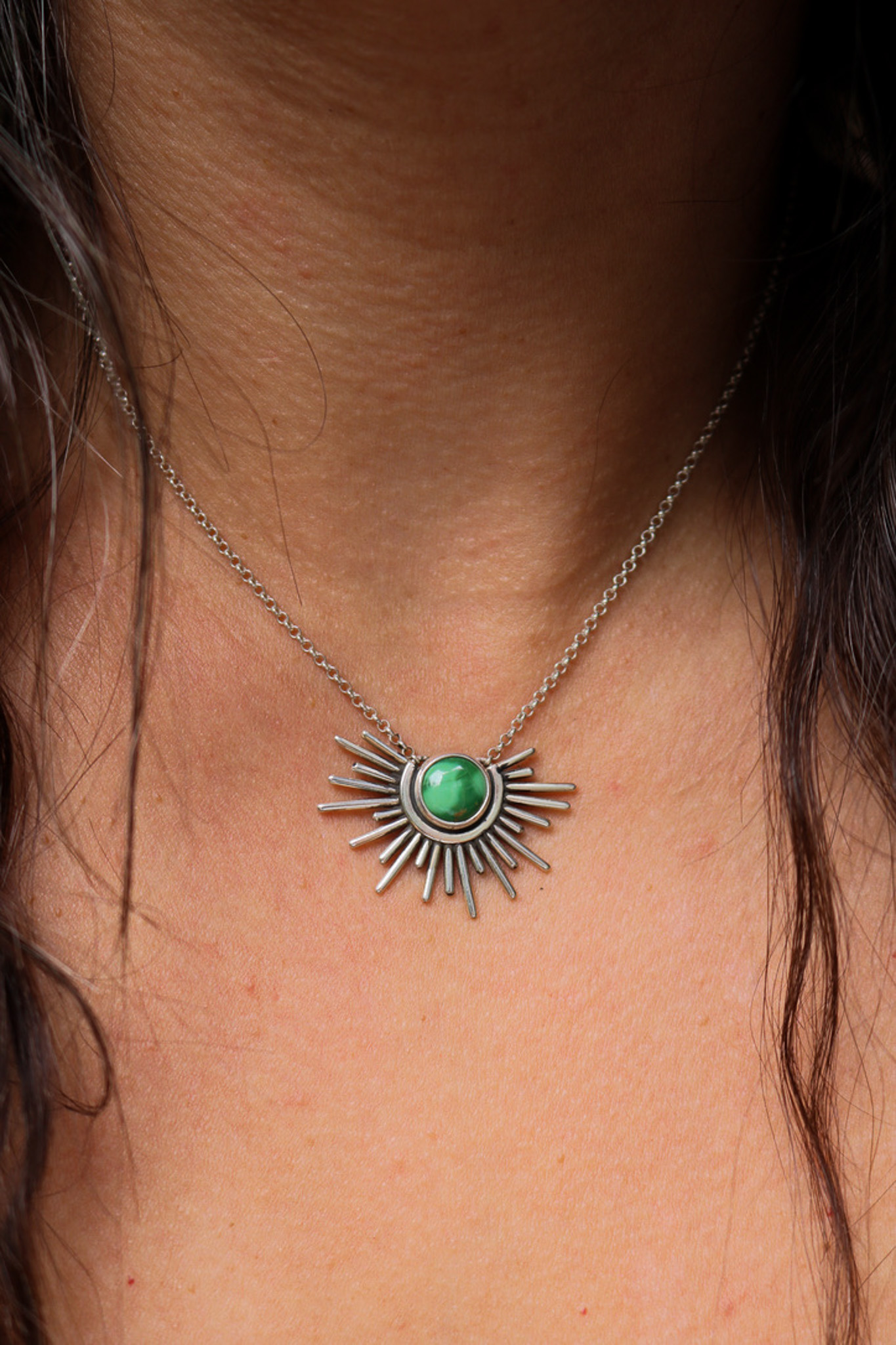 This pendant features lush Emerald Valley turquoise surrounded by brilliant, hand cut sterling rays. It’s hung from 2mm sterling silver rolo chain and the whole necklace measures 16-18″ long. Finished with a R+R signature tag and a high polish shine.