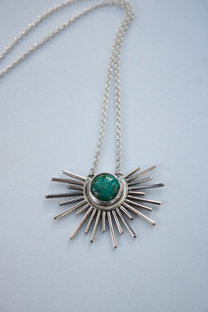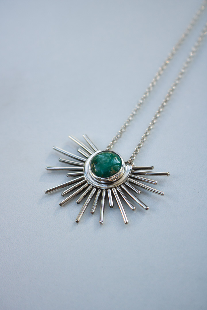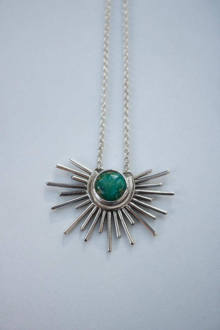 A hand-cut burst of sterling silver rays encircles a vivid piece of Sonoran Mountain Turquoise, like the sky holding the sun in its open palms. Each pendant is one of a kind, with its own distinct turquoise matrix and character. Strung on a sturdy 1.9mm sterling rolo chain with an adjustable length of 16–18 inches. Finished with a high-polish shine and my R+R signature tag — a mark of mountain-made craftsmanship.