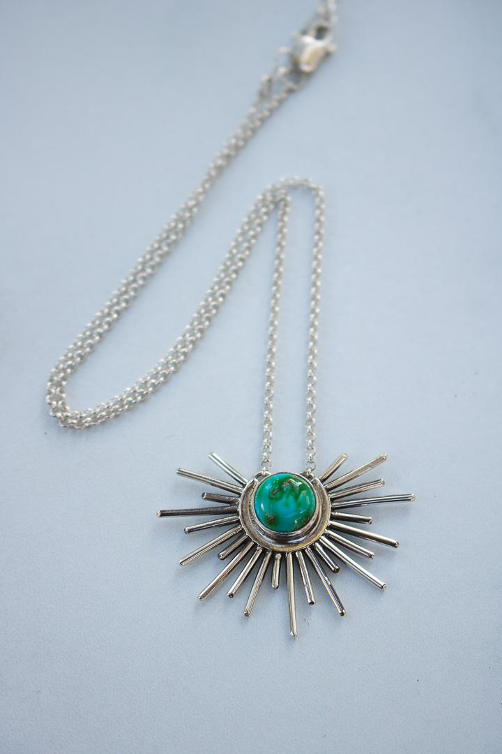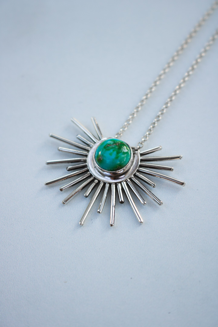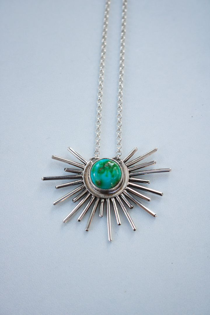 A hand-cut burst of sterling silver rays encircles a vivid piece of Sonoran Mountain Turquoise, like the sky holding the sun in its open palms. Each pendant is one of a kind, with its own distinct turquoise matrix and character. Strung on a sturdy 1.9mm sterling rolo chain with an adjustable length of 16–18 inches. Finished with a high-polish shine and my R+R signature tag — a mark of mountain-made craftsmanship.