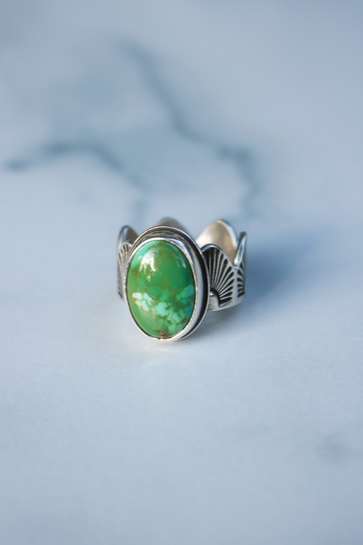 This one feels like high summer in the forest—bright, green, and full of life. The stone is a vibrant Sonoran Mountain Turquoise, the color of fresh-cut grass and sun-dappled leaves. I paired it with a hand-stamped sterling silver band and a scalloped edge I shaped by hand to echo the soft curves of nature. It’s been oxidized to deepen the details and finished with a high shine. It’s a size 7.5, but with the wide band, it fits more like a 7.