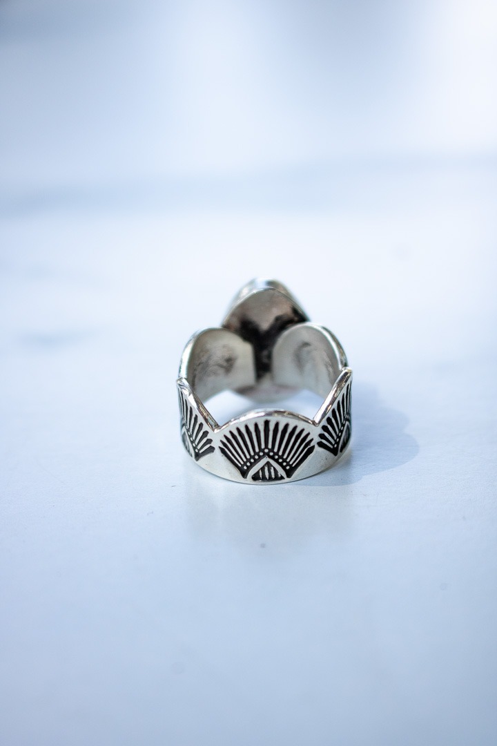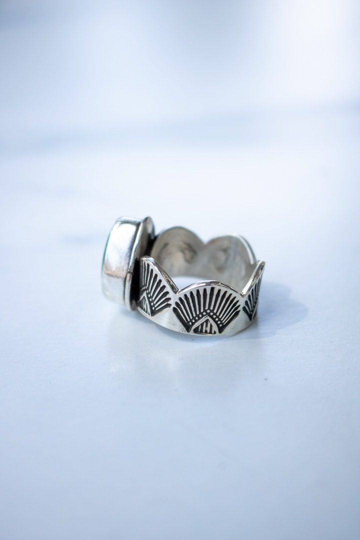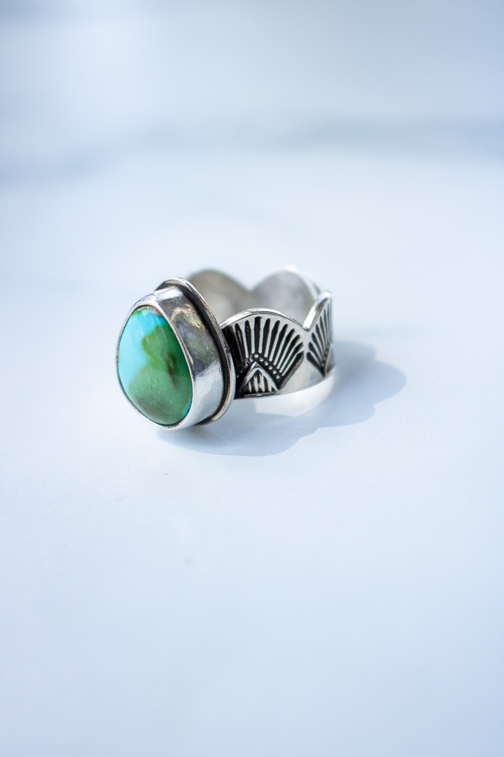 This one features a hand stamped sterling silver topped with vibrant blue and green Sonoran Mnt. turquoise and finished with a handcrafted scalloped edge. Oxidized and finished with a high shine. This rings is a size 8 but fits more like a 7.5 due to wide band.