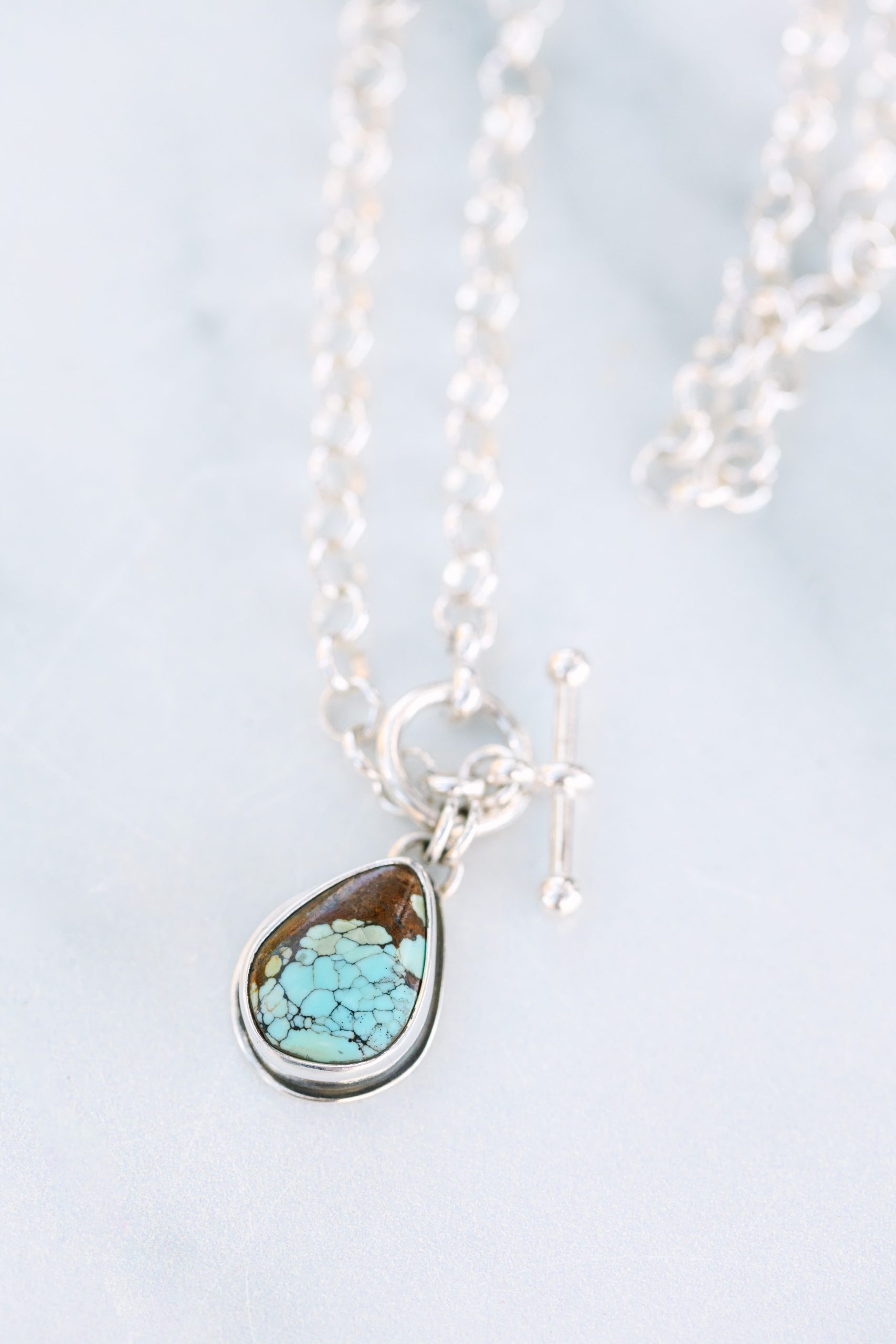 This particular necklace features a gorgeous piece of Blue Moon Turquoise set in a sterling silver bezel. It features a 17.4mm toggle on a 18″ 5.1mm chunky chain and R+R markers mark on the back. Its finished with a dark oxidation to high the details and then given a high shine polish.