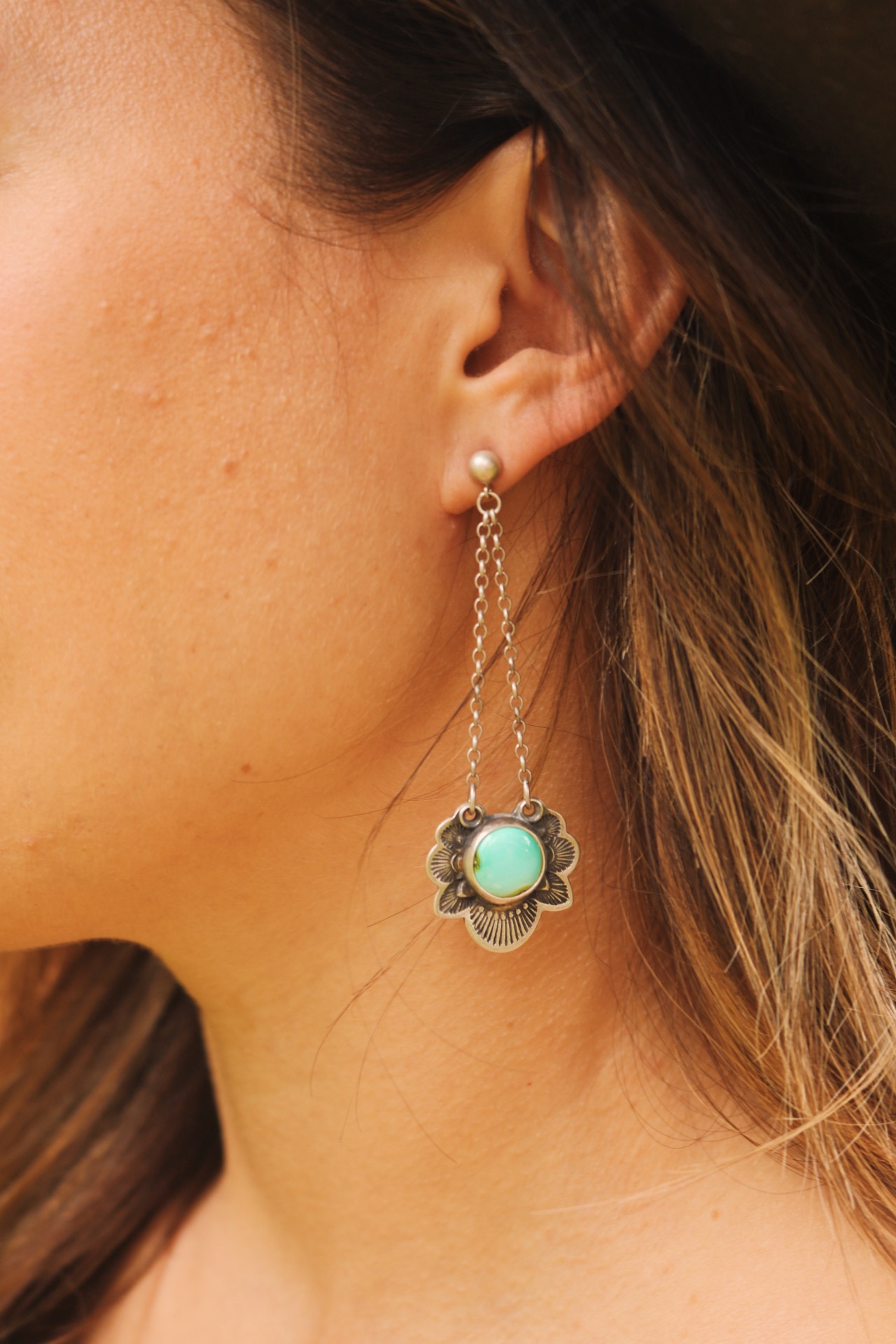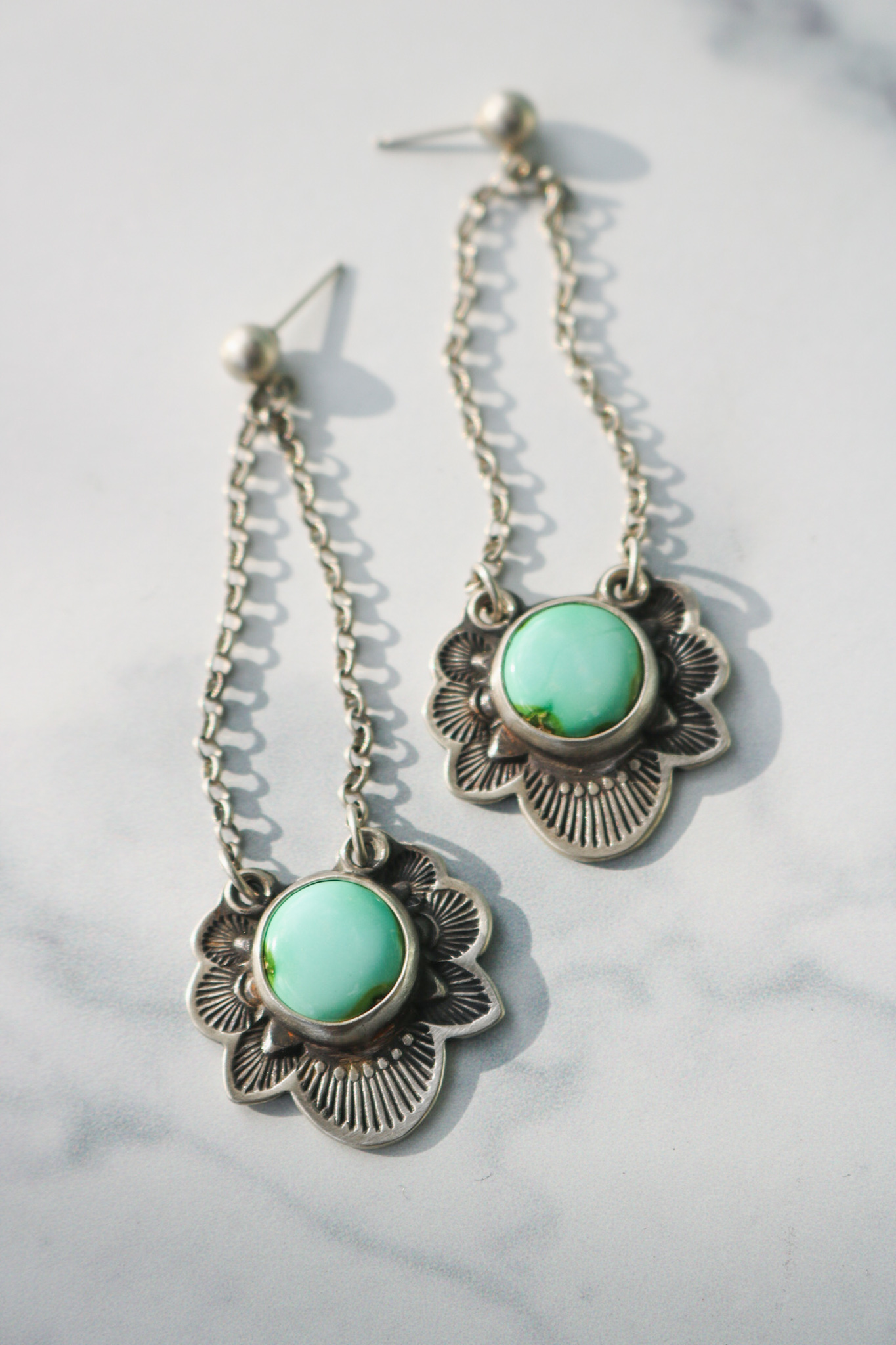 Vibrant Verde Valley Turquoise stones surrounded by stamped sterling silver and a handcrafted scalloped edge. Hung from a ball post with 1 1’2″ chains, oxidized and finished with a soft matte finish. The main pendants measure just under an inch wide and across. The earrings come with large ear nuts to keep these lightweight hoop secure and all components are sterling silver.