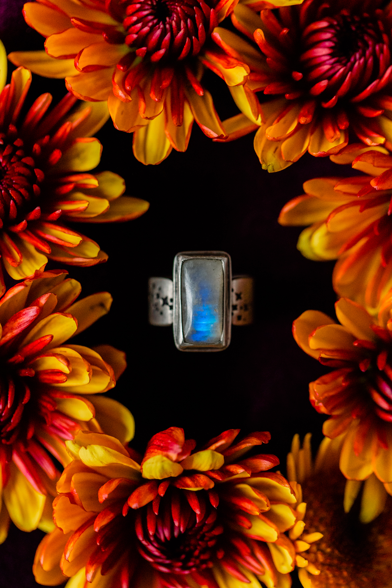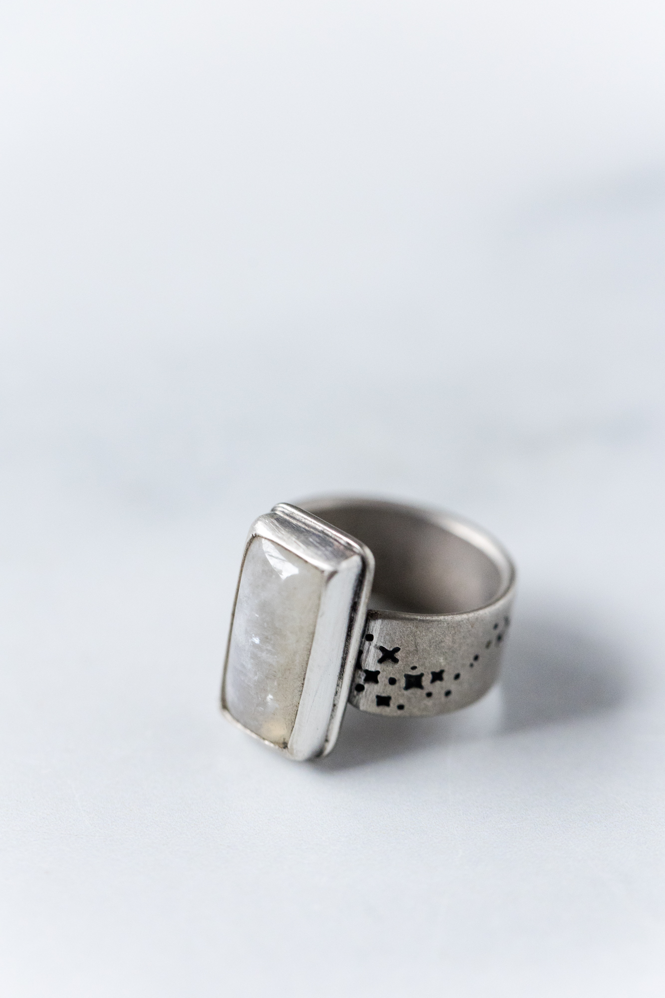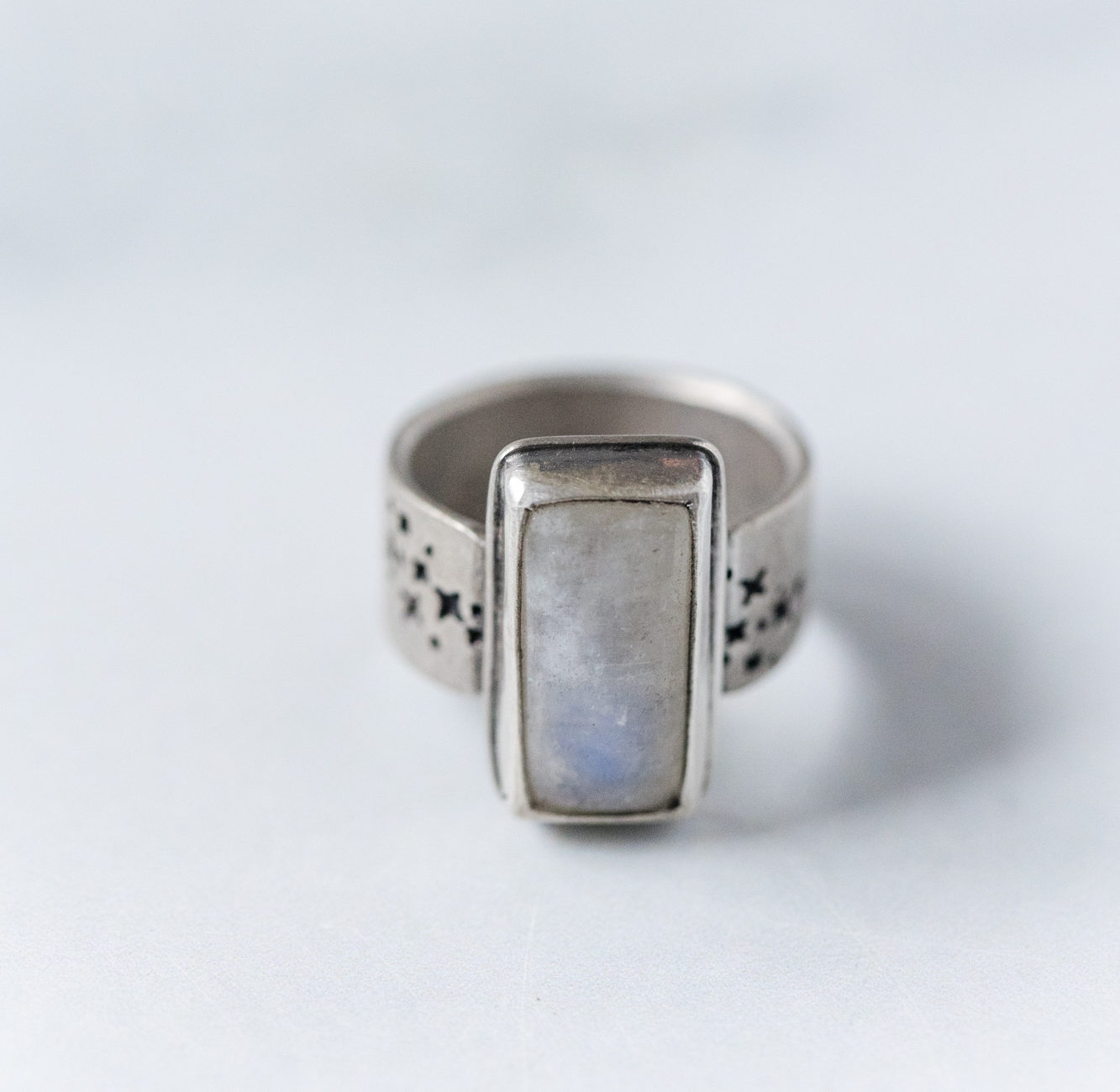 A flashing blue moonstone set on a wide sterling band. The band is stamped with a Milky Way design and given a soft satin finish. The ring fits between a size 5-5.5.